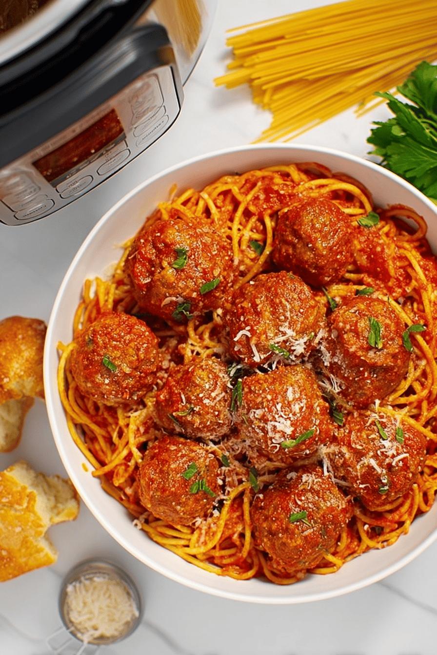 Mistura de carne moída com temperos tradicionais, moldada em almôndegas grandes, douradas rapidamente na função sauté do Instant Pot. Molho robusto de tomate com toque de ervas italianas e erva-doce, espaguete quebrado para cozinhar junto, tudo sob alta pressão. Resulta em prato com textura firme nas almôndegas, maciez no macarrão e molho encorpado sem precisar de panela extra. Varie usando leite de coco no lugar do evaporado para sabor diferente e substitua queijo parmesão por pecorino para um toque mais salgado e intenso. O segredo está no timing do cozimento e na liberação rápida para manter a textura da massa. Serve 4 facilmente.