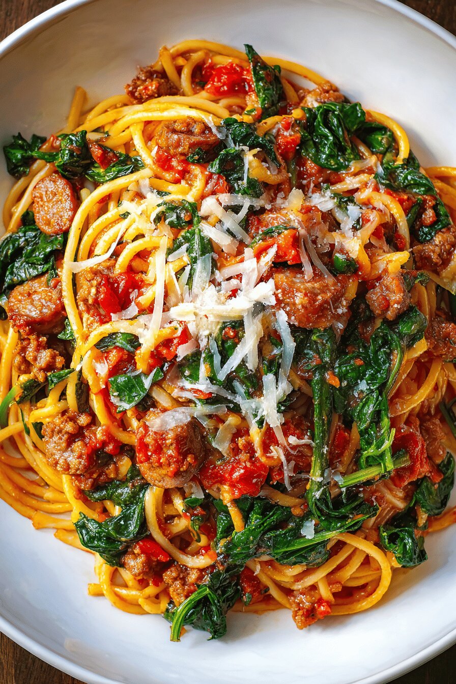 Espaguete com linguiça fina dourada, molho de tomate caseiro, espinafre fresco e toque de queijo parmesão. Receita simples, sem lactose, ovos ou nozes, com ingredientes que podem ser adaptados facilmente conforme o que tem na geladeira. Foco na textura da massa al dente, sabor marcante da linguiça e frescor do espinafre na medida certa. Tempo total cerca de 30 minutos, serve 4 pessoas. Recomendado para quem gosta de prato rápido, saboroso e que não exige muitos passos complexos. Versão brasileira com toque na linguiça e no molho.