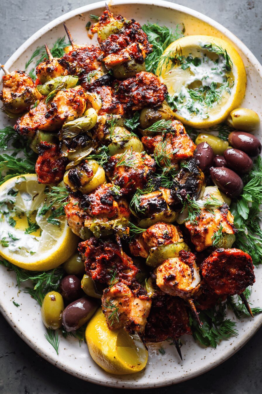 Cubos de frango marinados em especiarias intensas, alternados com fatias crocantes de chorizo e azeitonas verdes. Assados na grelha, exalam aromas potentes de ervas e fumaça, com textura miúda e suculenta. Um prato simples, mas que exige atenção no ponto do frango para evitar ressecamento. Pode ser servido com molho tahine ou molho de iogurte para equilibrar sabores intensos. Ideal para churrascos, com visual colorido e apelo imediato. Um petisco versátil que brinca com as notas picantes do chorizo e o frescor das azeitonas, na medida certa.
