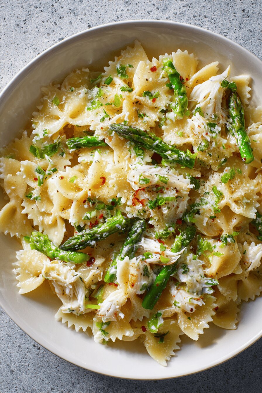 Massa farfalle cozida al dente misturada numa preparação cremosa de caranguejo, aspargos e toque cítrico de limão. O toque do mascarpone suaviza o caldo de galinha aromático enquanto os aspargos dão textura e cor. A redução do vinho branco concentra sabor e aroma. Ingredientes fáceis que se combinam num prato sofisticado, sem ovos e nozes para pessoas com restrições. A mistura do zeste e tomilho traz frescor. Receita para quatro pessoas, pronta em menos de uma hora, ideal para jantar rápido com cara de elaborado.