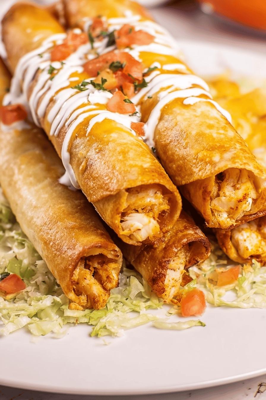 Flautas recheadas com frango desfiado temperado com especiarias, suco de limão e queijo tipo mussarela no lugar do blend mexicano. Envoltas em tortillas de farinha, fritas na frigideira até dourar e ficar crocante. Ótima para sobras, fácil e rápida, com aroma de especiarias e toque cítrico que corta a gordura da fritura.