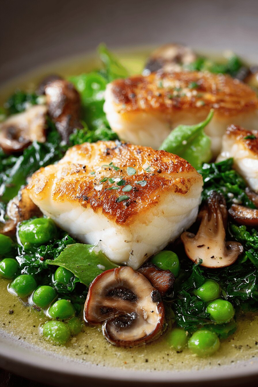 Peixe e vegetais. Temperos mínimos, método direto. Flétan, sabe? Peixe firme, sabor delicado mas que segura o cozimento por alguns minutos sem desmanchar. Manteiga vira noz, dá um toque amanteigado e torrado junto do peixe. Os shitakes, diferente dos pleurotes originais, dão aquele sabor terra-umami mais puxado, contrastando com o frescor da rúcula levemente murchada logo no final. Troca de ervilhas por edamame, porque tem textura diferente, gostinho verde mais adocicado, firme. Caldo de legumes hidrata, dá umidade enquanto tudo cozinha no mesmo lugar. Resultado? Um prato com camadas de textura e sabor, fácil e rápido. Sem lactose, sem glúten, sem nada de alergênicos comuns. Receita num jeito simples, básico, comida que não complica. Serve 4, jantar de pouco tempo, mas cheio de presença.