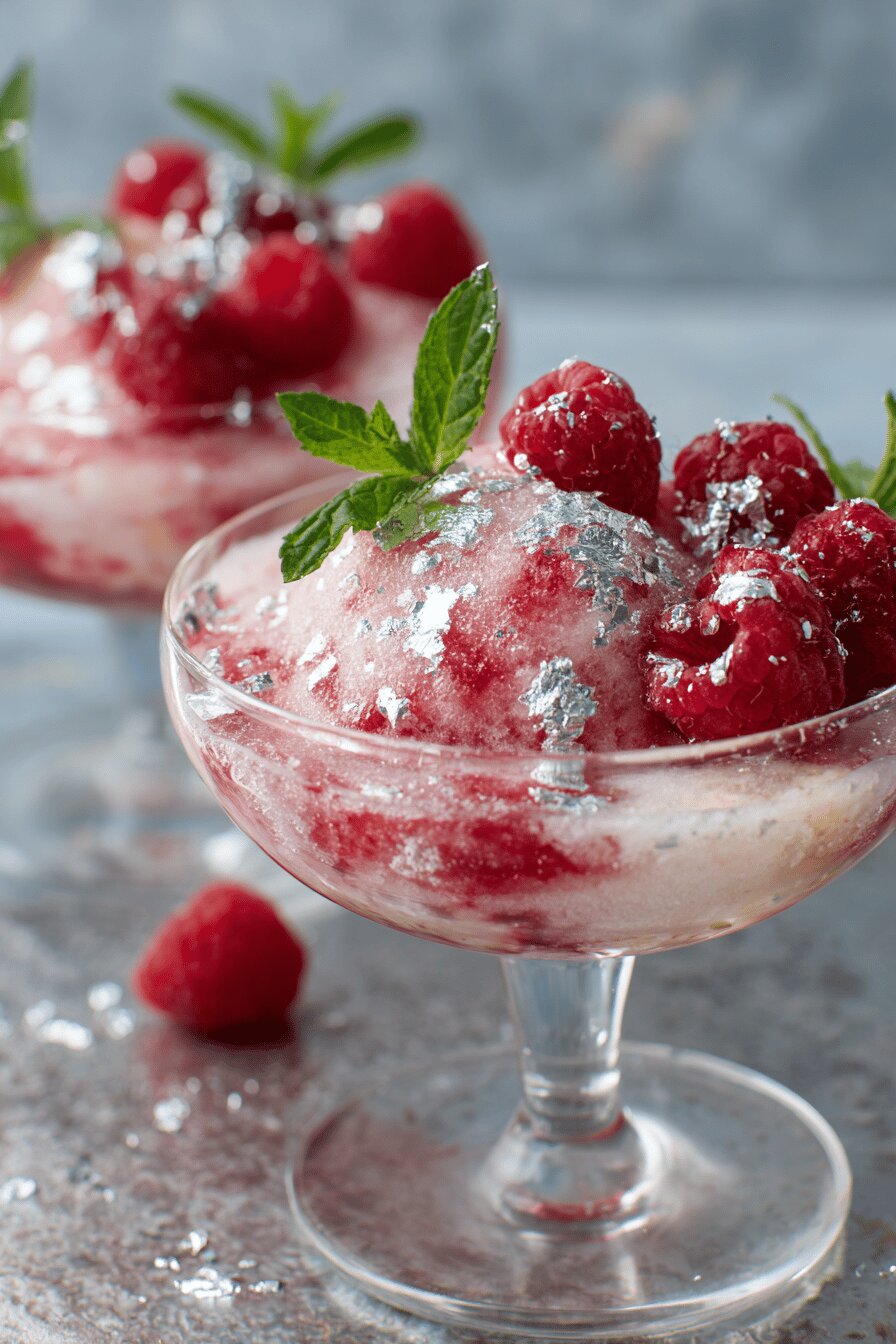 - Coloque uma bola generosa de sorvete vegano de framboesa no fundo de cada taça gelada.