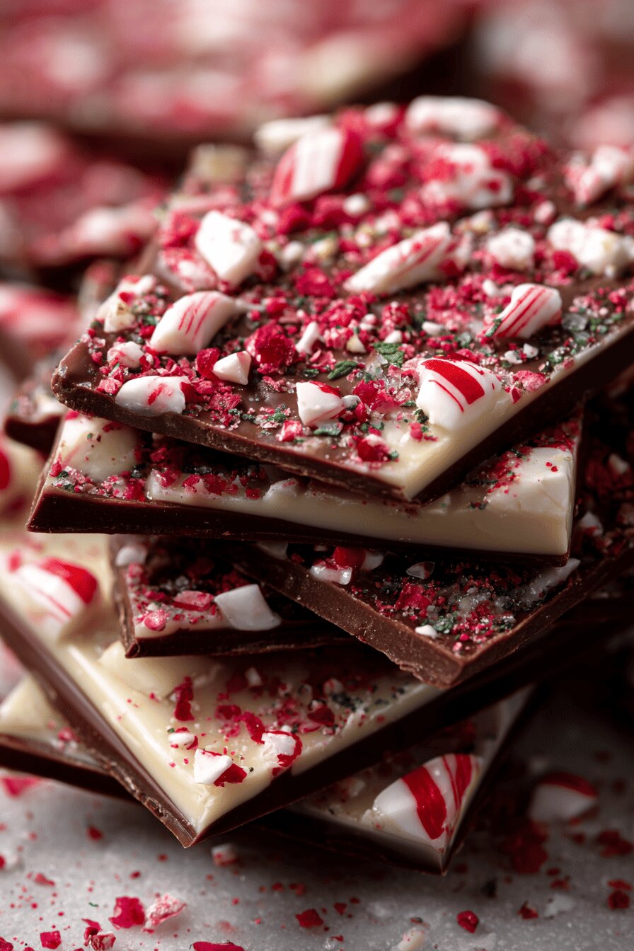 Mistura de chocolates ao estilo natalino, com toque crocante. Chocolate amargo e branco, cobertos com pedacinhos de paçoca e raspas de laranja seca. Camadas finas, rápidas de fazer, textura que quebra fácil. Doce que embala lembrança de festa, cheiro de casa, cheiro de infância. Dá para presentear, fazer em casa, rasgar em pedaços com a mão. Vai bem com café, com conversa, com aquele filme antigo na TV.
