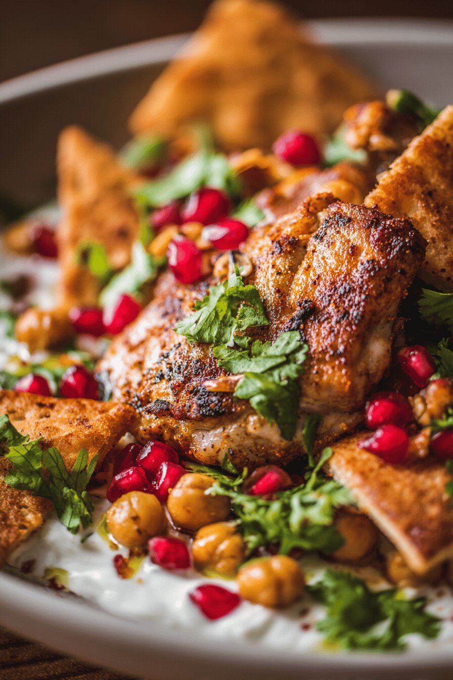 Comece preparando o molho para ganhar tempo, deixar a acidez incorporar. Corte os pitas uniformemente, isso ajuda a cozinhar por igual — nada mais frustrante que pedaço queimado e outro cru. Cozinhar o pita na manteiga, ouvindo como estalam na frigideira, dá o ponto de crocância; se perder o som ou eles ficarem amolecidos, é porque já passaram do ponto. Na hora do frango, evite mexer cedo demais para formar aquela crosta que caramba, dá gosto e textura. É tipo selar um bife — paciência. O toque final com água ajuda o grão a pegar tempero e manter umidade, mas não exagere para não virar ensopado. Na montagem, espalhe o molho com moderação para não deixar encharcado, o ideal é contraste entre cremoso e crocante. Sirva o restante do molho à mesa para quem quiser mais. Se não tiver romã, já testei com granada vermelha sem sabor forte, dá um charme visual e menos complicação. Faustão que me perdoe.