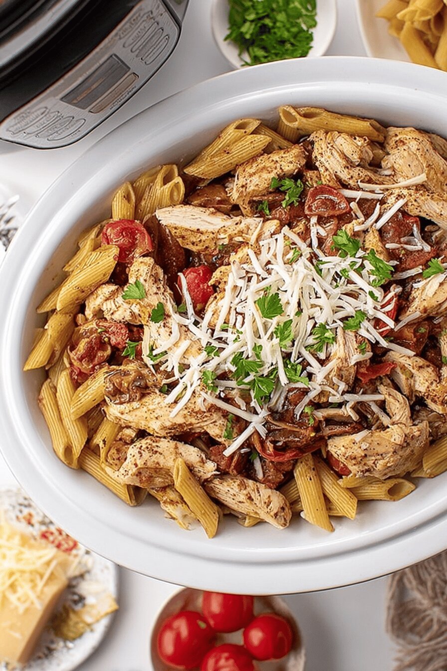 Frango cozido lentamente com tomate, vinagre balsâmico, cebola e temperos italianos. Desfiado e misturado com cogumelos, servido sobre massa e finalizado com queijo parmesão. Adaptado para variar ingredientes e tempos, destacando sinais visuais e texturais para guiar o cozimento, garantindo sabor e textura ideais. Sugestões práticas para substituições e cuidados na execução, com passo a passo reorganizado, priorizando a experiência sensorial e a eficiência na cozinha.