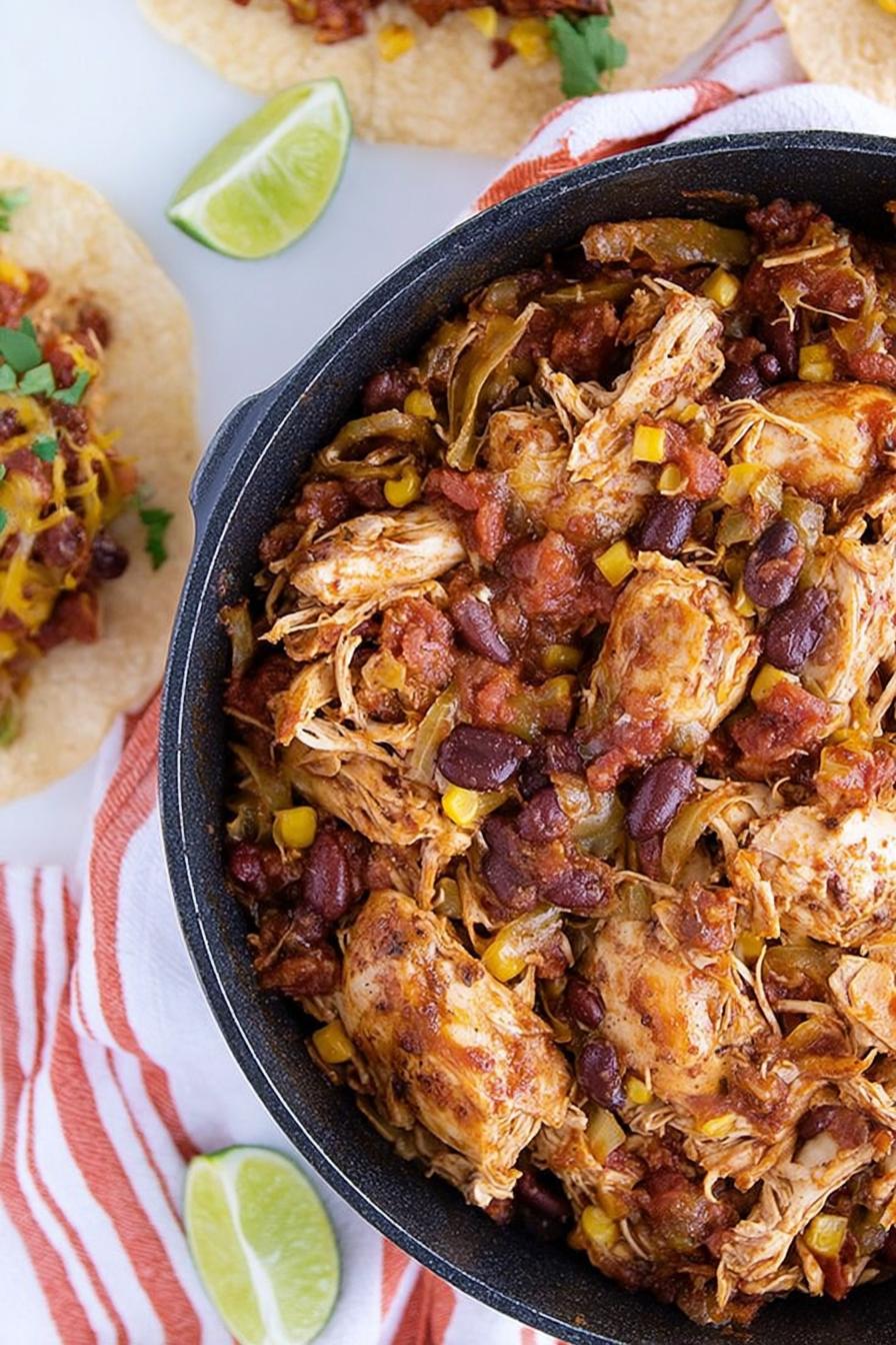 Frango de peito cozido lentamente com tempero estilo taco, feijão, milho, molho de tomate e batatas, resultando numa mistura rústica e saborosa. O frango é desfiado e reincorporado ao molho para absorver os temperos, servido com tortillas ou arroz. Ajustes na rapidez do cozimento e substituições garantem versatilidade e praticidade. Ideal para refeições sem stress, com texturas macias e aromas que lembram feijão tropeiro com pitada mexicana.