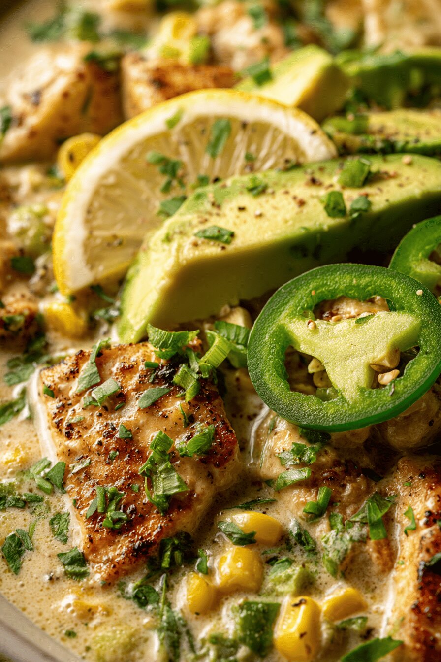 Frango suculento com molho cremoso feito a base de pimentão ancho tostado, milho grelhado e coentro fresco. Preparação simples com ingredientes levemente alterados para dar um toque especial, sem glúten, sem ovos e sem nozes. Temperos equilibrados, textura rica pela creme de leite e um toque cítrico. Rápido para fazer, boa opção para almoço ou jantar. Finaliza com abacate fresco, limão e pimenta jalapeño opcional para quem curte picância.