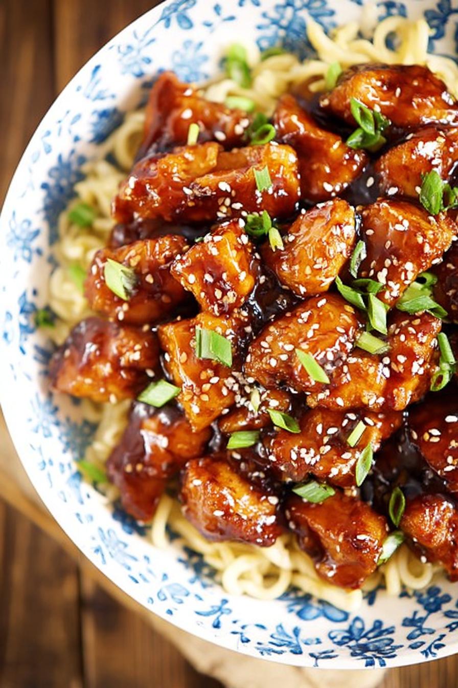 Frango em pedaços cobertos por amido, dourado na frigideira, com molho agridoce à base de hoisin, shoyu, açúcar mascavo e temperos marcantes. Servido com noodles ramen cozidos ao ponto, sem os pacotinhos de tempero. Molho reduzido até encorpar, envolvendo tudo. Toque apimentado a gosto, terminado com gergelim e cebolinha para contraste. Uma mistura inesperada de sabores e texturas que exige atenção aos detalhes visuais e olfativos para acertar o ponto.