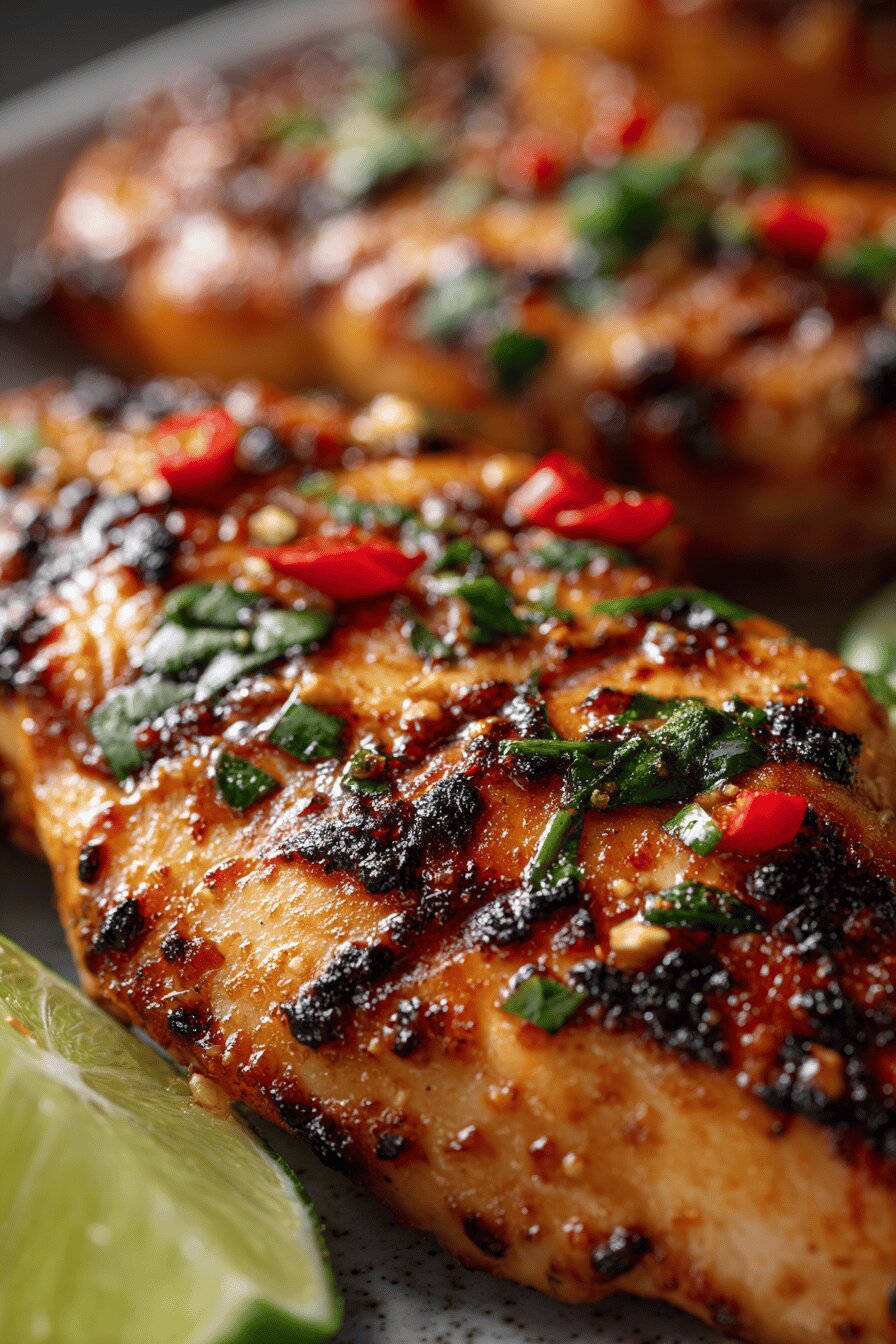 Molho com menos óleo e mais sabor. Troca de tamari pelo shoyu comum para acessibilidade. Vinha densa com limão no lugar do vinagre de arroz. Toque de pimenta calabresa italiana no lugar do sambal oelek, mais suave. Gengibre ralado mais fresco, menos tempo marinado para evitar ressecamento do frango. Fatias de peito de frango, cozidas na grelha com calor direto e depois indireto, com descanso para suculência. Acompanhado de arroz branco e folhas verdes. Sabor oriental com leve picância e acidez, textura macia com caramelização controlada.
