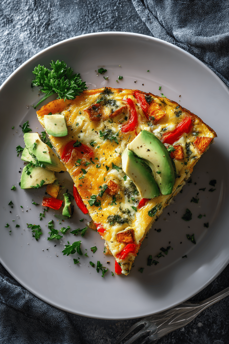 Frittata cremosa com batata doce e pimentão assados, ovos batidos com queijo Minas meia cura e cheiro-verde. Uma mistura de texturas entre o adocicado da batata e o defumado do pimentão assado. Ideal para vegetarianos, sem glúten e sem castanhas, fácil de preparar e adaptar. Tem toques de abacate para frescor e cremosidade na finalização.