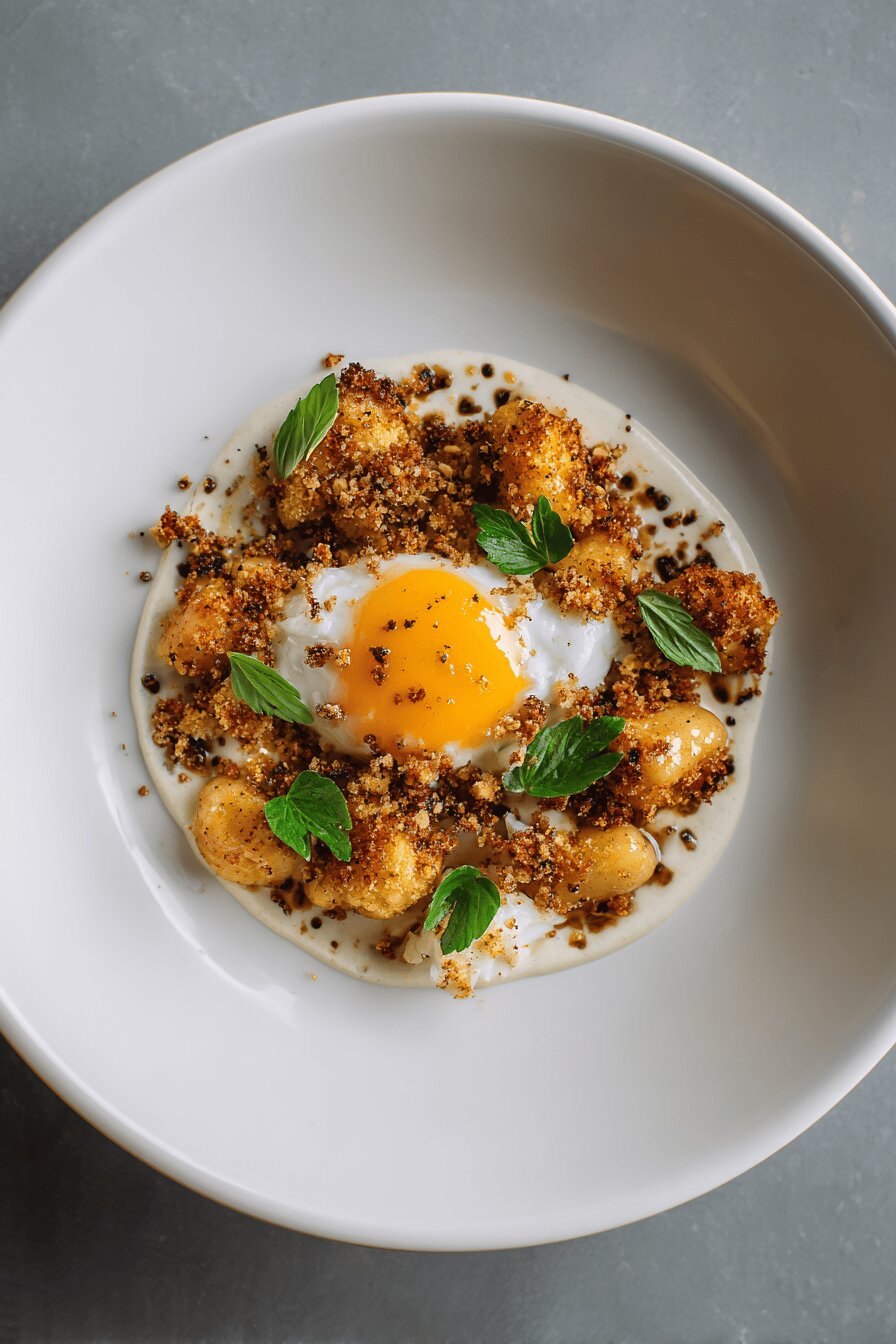 Gnocchis de ricota fresquinha suspensos num molho de velouté de frango, acompanhados por pedaços dourados de couve-flor caramelizada, cobertos com uma crocante chapelure de pão e amêndoas — essa combinação traz camadas de textura e sabor que só quem já batalhou com massa fresca sabe reconhecer. O truque é controlar a textura da massa, reconhecer a hora certa de dourar a couve-flor que entrega aquele aroma tostado, e apostar no contraste da gema para dar untuosidade na mordida. Nada de pressa, cada etapa pede respeito pelo tempo e sensações: pegar o ponto da massa olhando, sentir o cheiro da chalota, ouvir o crepitar da couve-flor. Tudo isso conjuga um prato cheio de personalidade.