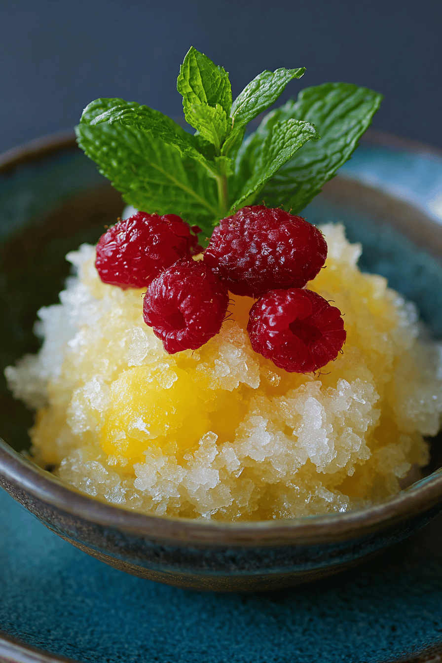 Bater tudo até virar um purê liso, mas não precisa ficar perfeito — textura rústica ajuda no final. Peneirar ajuda dar cristais mais lisos depois de congelar, evita pedacinhos grandes. Congelar 7 horas no mínimo, pra solidificar bem e facilitar raspar. Na hora de raspar, garfo é melhor que colher, esfrega e solta os pedacinhos gelados. Servir logo depois pra não derreter. Dá pra guardar na geladeira, mas perde a textura granulada. Pode incrementar com folhas de hortelã para aroma ou gotas de água de flor de laranjeira para sofisticação.