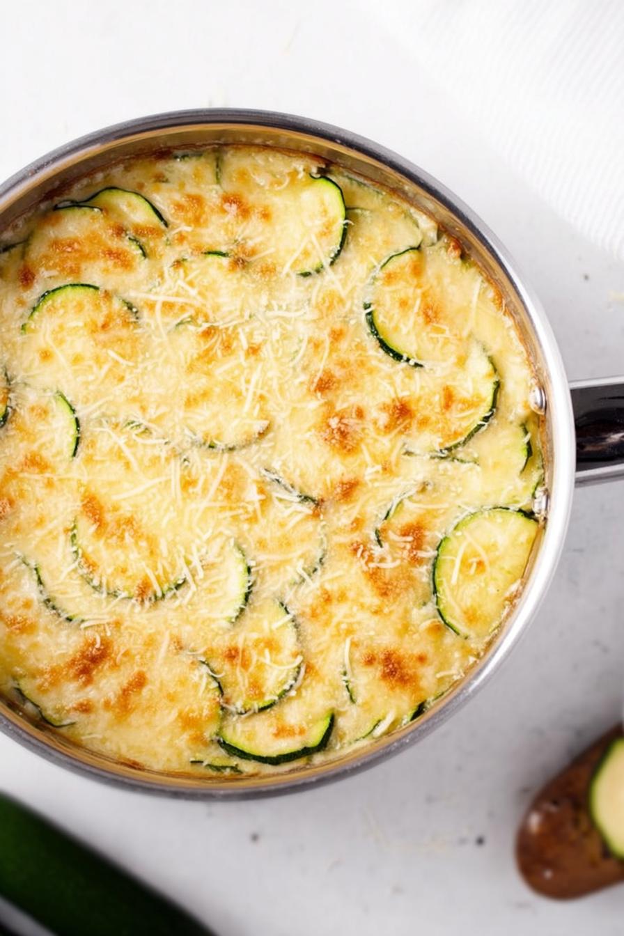 Gratin salgado feito com abobrinha cozida na manteiga com cebolas caramelizadas, alho, creme de leite e caldo de carne, finalizado com queijo parmesão e queijo prato gratinado no forno. A textura traz equilíbrio entre maciez e firmeza da abobrinha, e o toque do alho suaviza o doce da cebola. O prato vai bem com carnes como frango ou porco. Fácil, com toque sofisticado e bastante sabor, rende seis porções com calorias moderadas e boa quantidade de proteínas e gorduras.