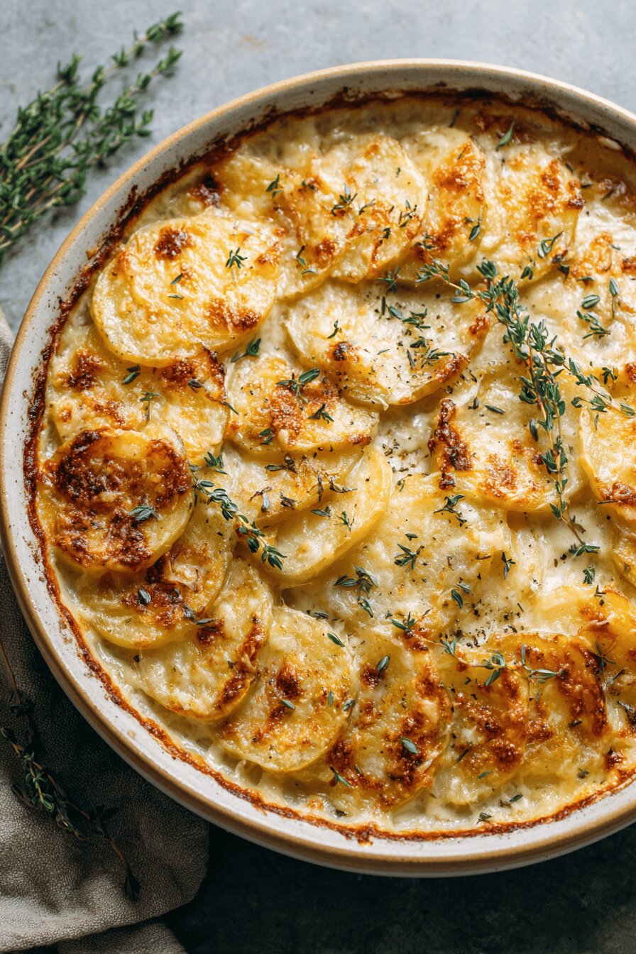 Gratin de batata adaptado, com alho confit cremoso e camada extra de queijo gouda. Batatas fatiadas fininhas e cozidas lentamente no creme com alho levemente adocicado, queijo derretido e toque de noz-moscada em vez de pimenta. Repetição de camadas alterna textura, garante um gratinado úmido mas com crosta por cima. Fácil testar variações com creme de leite fresco e temperos. Pronto para acompanhar carnes assadas, frango ou peixe. Sem ovos, sem gluten, vegetariano e sem nozes, agrada a muita gente. Sabor de casa, cheiro intenso de alho sem ser agressivo. Gratinar até borbulhar e dourar, sinal visual certo do ponto ideal.
