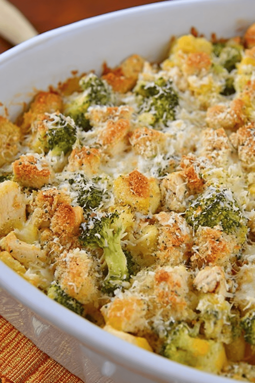 Combinação de massa, frango, brócolis crus, queijo e bacon num gratinado cremoso. Leite integral, sopa cremosa de cheddar e maionese criam molho rico e a cobertura crocante de croutons oferece contraste surpreendente. Facilidade e sabor caseiro com ajustes práticos para ingredientes e tempo, resultando em receita versátil para várias ocasiões. Serve 6 porções generosas.