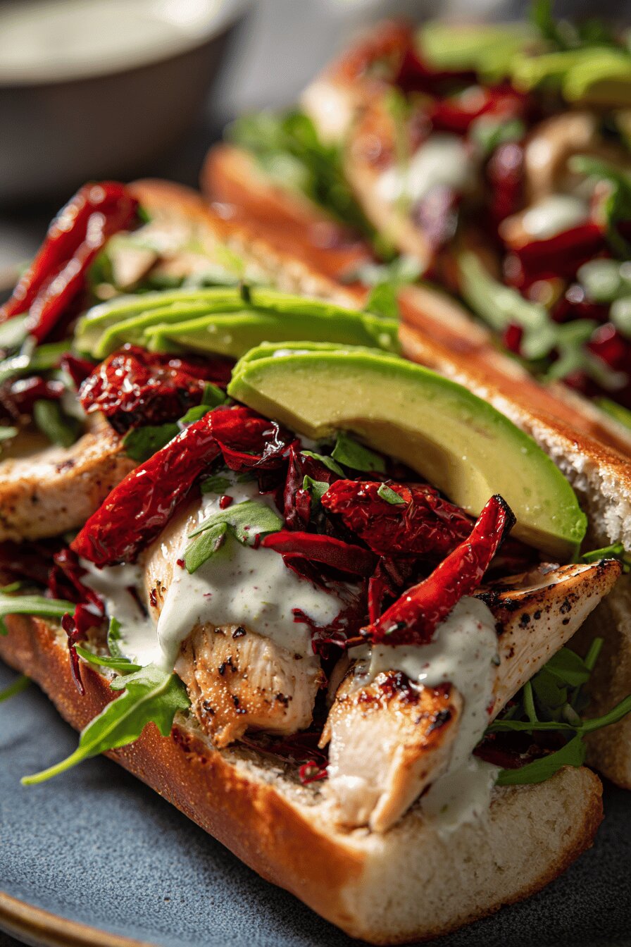 Sanduíches tipo guédilles com peito de frango grelhado, alface crocante e um toque picante na maionese que combina creme azedo e pimenta jalapeño. O pão é tostado para dar textura e evitar umedecer. Receita adaptada para paladar brasileiro, trocando a alface iceberg pela crisp romaine, e a tomate por tomate-cereja para mais suculência. Temperos equilibrados para quem gosta de descobrir camadas de sabor sem exageros, com a versatilidade de usar iogurte natural no lugar do creme azedo. Muito fácil de montar, ótimo para um almoço rápido, e a criatividade permite substituir o frango por um peixe grelhado se quiser dar uma quebrada no clássico.