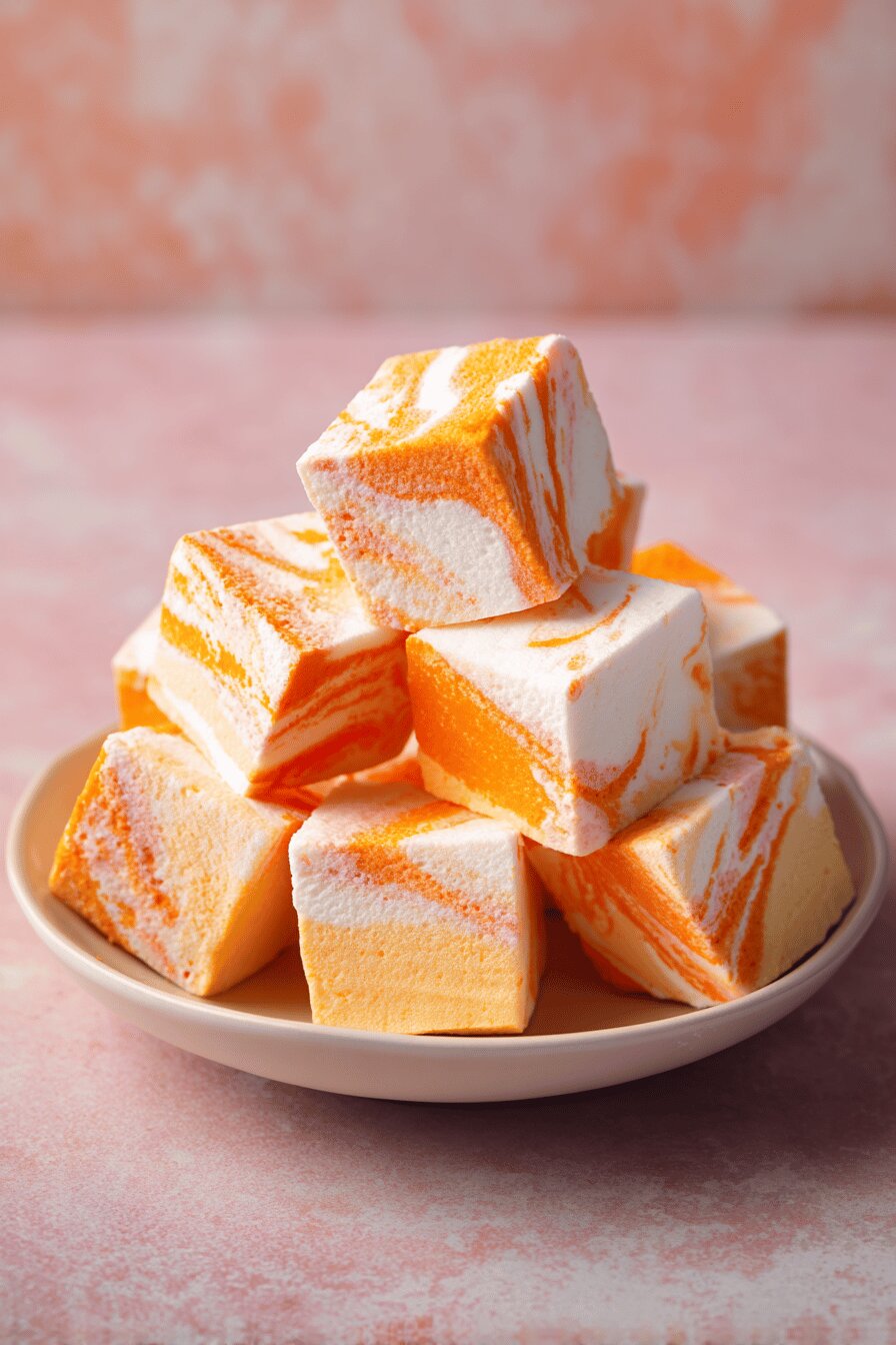 Guimauve com toque de laranja e baunilha, sem lactose, sem glúten e sem ovos. Combina o doce leve e aerado com um xarope cítrico que traz frescor. A textura macia contrastando com o toque azedinho, feito em camadas marmorizadas. Receita adaptada para facilitar o preparo e maximizar o sabor natural, com glicosas alternativas e técnicas para evitar grumos. Ideal para quem quer um docinho artesanal, feito em casa com ingredientes simples e controle total sobre a textura. O uso da baunilha natural e suco concentrado congelado traz complexidade aromática. Toque pessoal adiciona um zest de laranja para dar um frescor extra.