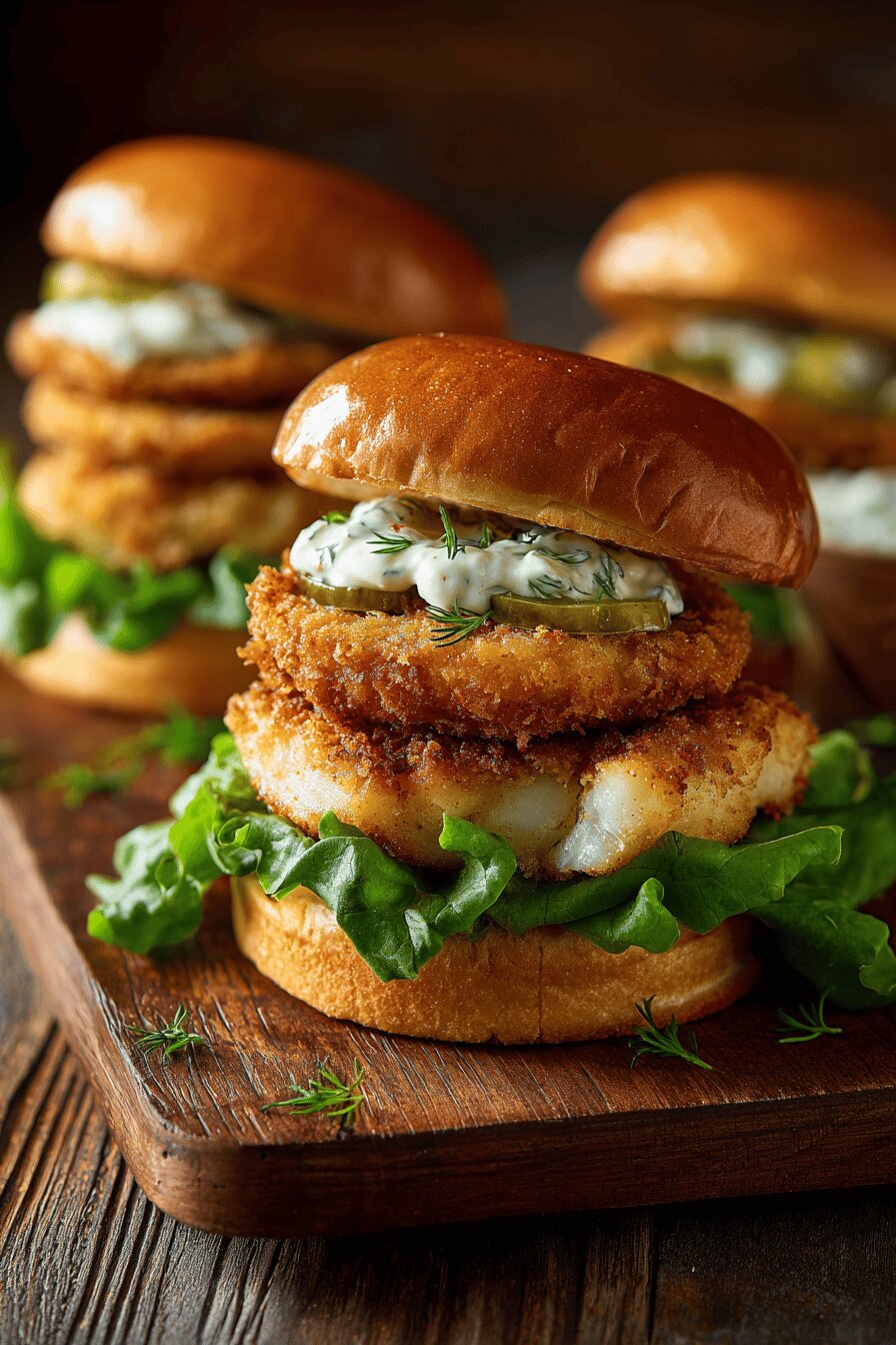 Hambúrgueres de bacalhau empanados numa massa aerada com cerveja clara, acompanhados por picles crocantes fritos. Maionese temperada com wasabi e toque de limão para equilibrar o sabor. Troca do aneto pelo coentro fresco para dar frescor diferente. Pães de brioche usados pra contraste de textura, além da alface americana. Método para fritura eficiente, textura perfeita, dicas pra garantir que peixe não desmanche. Ótima opção para quem quer peixe no pão com crocância e sabor marcante. Controles visuais garantem a crocância e cozimento interno sem ressecar. Receita sem glúten e lácteos possíveis com substituições simples.