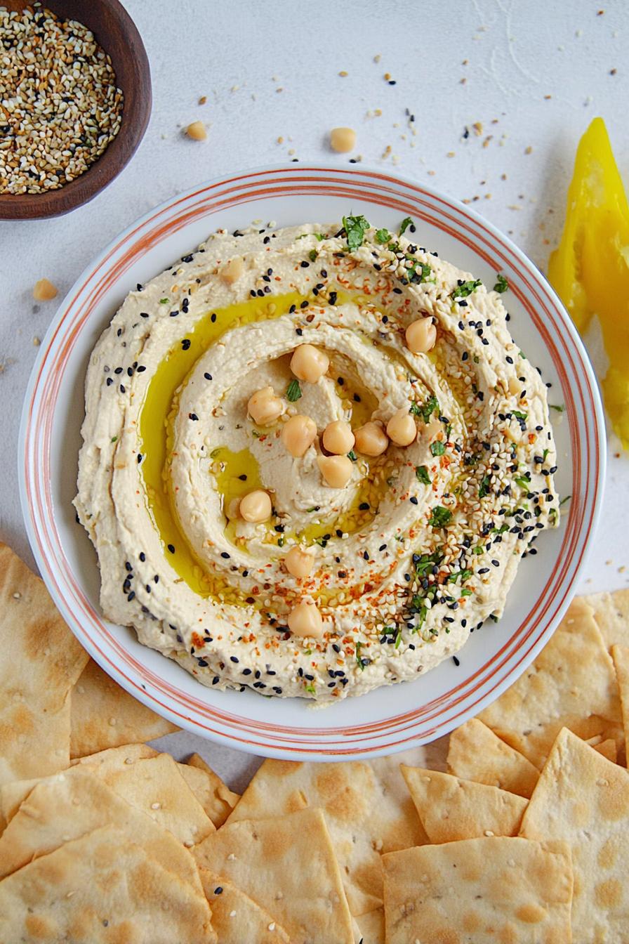Usar processador é essencial para conseguir a textura cremosa do hommus, a quantidade de água deve ser ajustada conforme observa a textura, pode ir colocando aos poucos para não passar do ponto. A emulsão do tahine com azeite é a base; se pular isso, o hommus fica mais denso, menos sedoso. Bata o tahine e azeite até ficar visivelmente mais claro e volumoso — é sinal que o ar entrou e a emulsão ocorreu. Quando misturar os ingredientes, processe em etapas para poder controlar o ponto. Se processar demais, a textura pode ficar grudenta, quase como pasta de amendoim, e isso não queremos. Ajuste o tempero por último, prove o hommus e mexa com calma para não perder a textura aérea criada. Finalizar com a crocância do tempero ’everything bagel’ adiciona vida ao prato, evita que fique monótono. Serve simples, acompanhando uma cerveja gelada ou um vinho leve em dias de calor bom.
