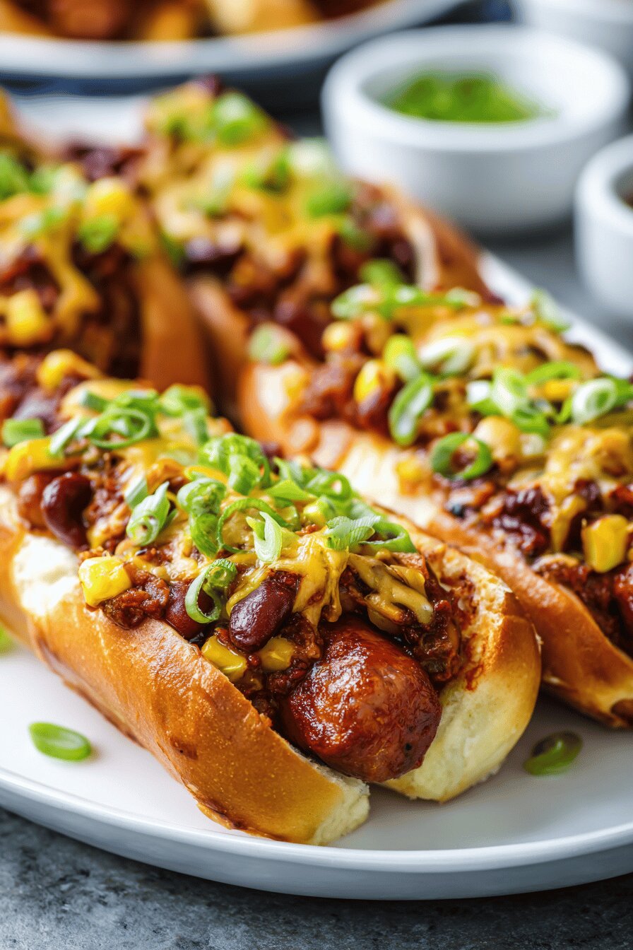 - Corte os pães no sentido do comprimento, sem separar completamente as metades para segurar tudo junto. Preferível tostar levemente na frigideira ou no forno até o pão esquentar e ganhar um pouco de crocância -- ajuda na textura e suporte do recheio pesado. Abra, espalhe uma generosa camada do molho de queijo, use cerca de 1/4 para cada pão. Coloque as merguez fazendo uma leve sobreposição, esprema leve para acomodar mais chili depois. Cubra com o chili, fechando com o restante do molho de queijo. Finalize com a cebolinha para frescor e cor. Feche os pães com firmeza mas cuidado para não extravasar o recheio. Corte em pedaços típicos para o compartilhamento, tipo 3 dedos.