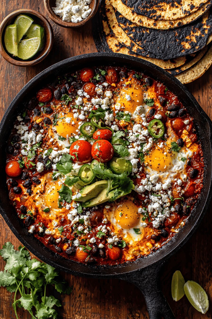 Versão na brasa desses ovos rancheros, temperados com pimentas, tomates estourados e feijão preto bem cremoso. O queijo feta traz salinidade e a salsa fresca, um contraste herbal. Uma pitada de vinagre equilibra e amacia o feijão. Use panela de ferro pra pegar sabor e garantir cozimento uniforme. O segredo? Observar o tempo dos ovos pra gema escorrer – nada de gema dura aqui. Pode substituir o feta por queijo minas ou até ricota temperada. Se não curtir pimenta fresca, dá pra trocar por páprica defumada. Chama, que não tem erro.