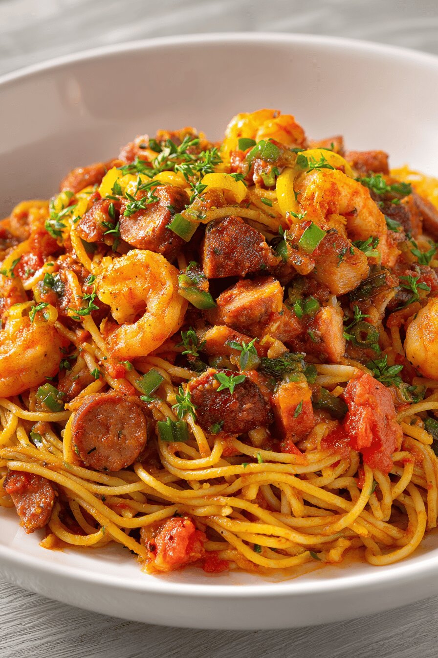 Sequência lógica que mistura sabores fortes da cozinha cajun com o conforto do espaguete. Troquei o tradicional pimentão amarelo por vermelho, porque acho que a cor dá outra vida no prato e o sabor fica mais intenso. A massa é o palco, as carnes e frutos do mar são protagonistas — mas só funcionam se a energia deles estiver bem equilibrada. Aprendi na prática que o segredo tá no timing da cocção; o camarão passado demais endurece, o frango tem que dourar e manter suculência. O suco de laranja entra como um truque para quebrar sabores fortes do chorizo e não usar ácido direto como limão; traz doçura e frescor ao molho. Serve para quem gosta de se arriscar em fusões e de mudar um pouco os clássicos, sem perder a alma do prato.