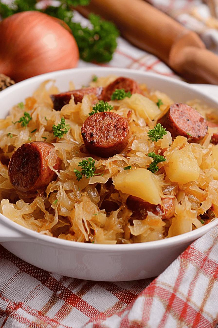 Kielbasa cozida lentamente com chucrute, cebola, e uma pitada de açúcar mascavo, com toque de maçã para equilibrar o azedinho. Um prato que junta especiarias e texturas em uma lenta transformação de sabores, ideal para reunir amigos com ingredientes acessíveis e transformação prática no fogão lento.