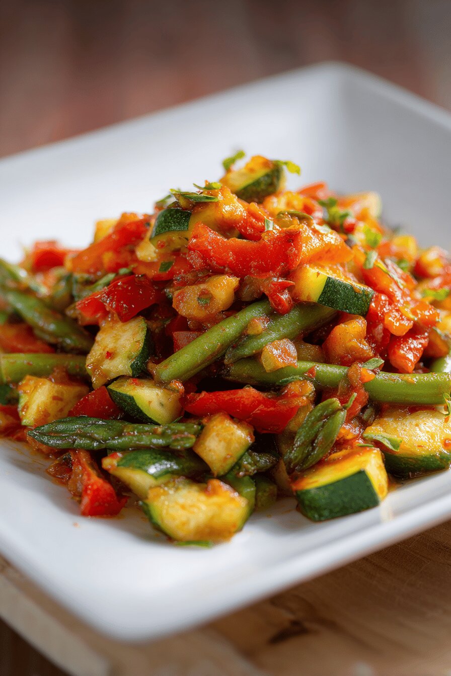 Mistura colorida e quente de berinjela, pimentão vermelho, cebola, alho, tomates em cubos e vagem. Vegetal, sem glúten, lactose ou ovos. O cozimento vai até os legumes estarem macios, liberando aroma intenso e sabor levemente adocicado. Fácil preparo, toque mediterrâneo e ótimo acompanhamento ou prato leve. A textura é macia porém mantém forma, com molho encorpado. Substituir ingredientes é tranquilo; deixa o prato versátil e sempre convidativo na mesa.
