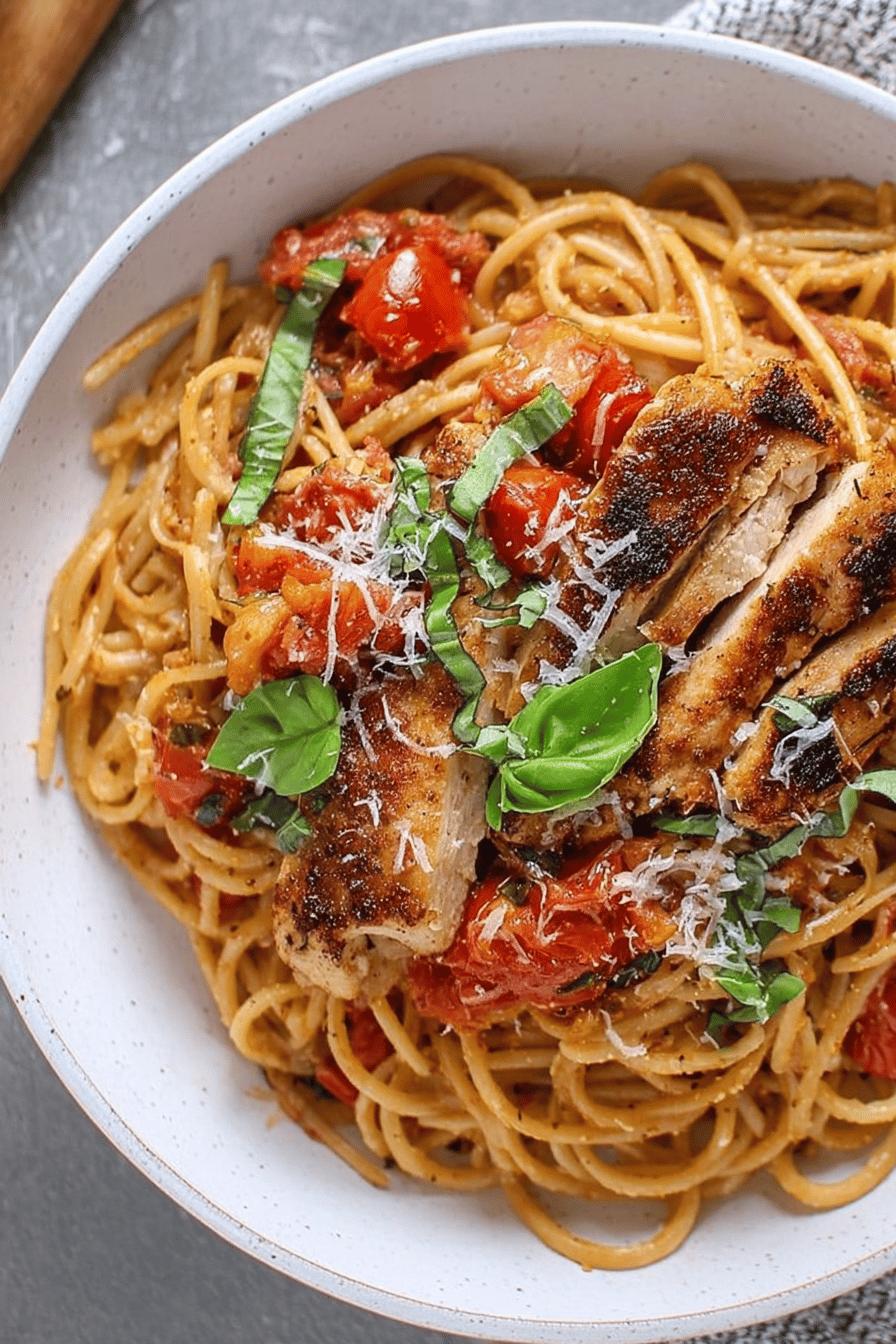Frango fatiado, temperado com vinagre balsâmico, combinado com espaguete cozido direto na panela junto ao molho de tomate fresco, cebola e alho refogados. Uma pitada de ervas italianas caseiras e sementes de erva-doce dão sabor e aroma. O toque final fica por conta do manjericão fresco e queijo parmesão ralado na hora. Cozimento prático, sem complicação, com técnicas para textura e sabor ideais, perfeito pra quem gosta de misturar tradição com um toque pessoal na cozinha.