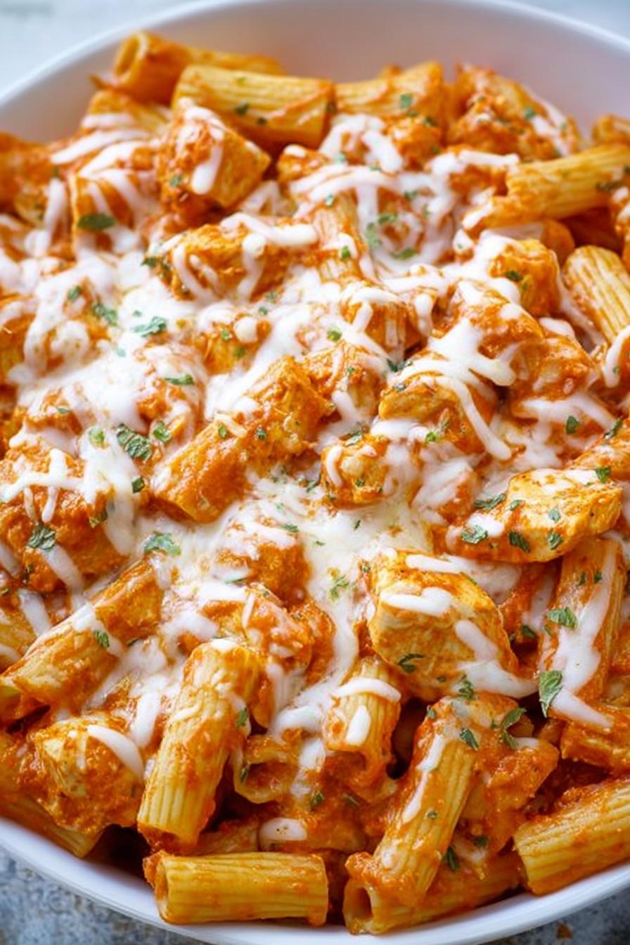 Um prato de massa cozida junto com pedaços suculentos de frango temperados e queijo derretido. Usa rigatoni, molho de tomate e caldo de galinha para cozinhar tudo numa panela só, facilitando limpeza e agregando sabor. Ótimo para quem quer jantar rápido sem abrir mão do conforto de um prato encorpado. O toque de queijo mozzarella e parmesão por cima derrete e forma uma crosta cremosa e irresistível. Ideal para 6 pessoas.