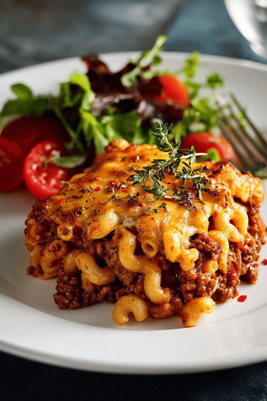 Macarrão cozido al dente envolto em molho suculento de carne moída temperada com tomate e ervas, coberto por molho cremoso de queijos cheddar e muçarela gratinado no forno. Uma combinação de texturas e sabores com toque apimentado sutil e aroma de alho e cebola refogados. Adaptável para trocar tipos de queijo e ajustar pimentas conforme gosto. Ideal para quem curte comida reconfortante, feita com cuidado e sem complicações.