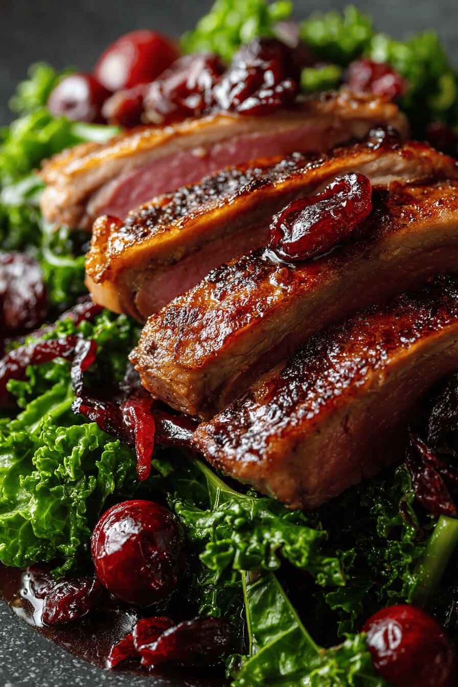 Legumes para o molho são simples mas precisam estar bem picados para cozinhar rápido e liberar sabor. Manteve o aipo e cenoura como base clássica. O vinho deve ser bom para beber, porque vai concentrar ainda mais. Molho fica com uma textura aveludada depois de passar pela peneira. A quantidade de melaço e tomate foi levemente reduzida para evitar o toque doce excessivo que pode mascarar o sabor do pato. Use chocolate amargo acima de 80% para não ficar doce, picado para derreter rápido. Pode trocar o melaço por melado de cana ou açúcar mascavo escuro. Couve manteiga nem tão fibrosa, nem muito mole, é fácil de achar no Brasil e segura bem o calor da frigideira. Passas substituem cranberries, dão um agridoce diferente e bem brasileiro. Quanto ao pato, magret fresco e com gordura de qualidade faz diferença no resultado final, evite congelados.