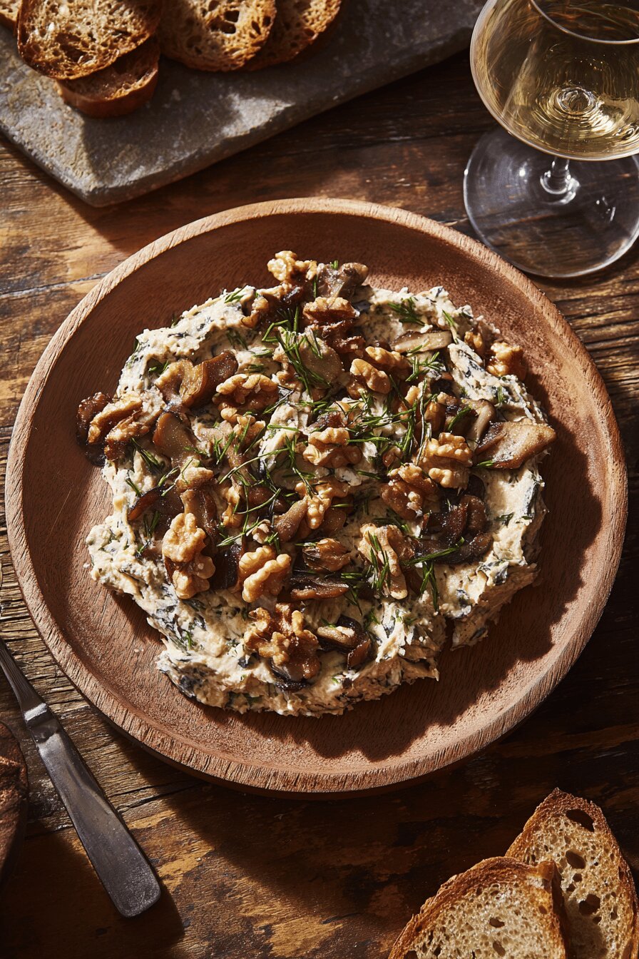 Manteiga feita com creme fresco infusionado com funghi secchi, misturada a castanhas tostadas e ervas frescas. Receita prática, sem glúten, ideal para anfitriões que gostam de explorar sabores terrosos e texturas crocantes. Técnica de bater creme para separar manteiga do soro, garantindo textura cremosa e firme. Uso de castanhas do pará para uma mudança de sabor e alecrim para aroma. Para comer com pães artesanais, tacos ou até legumes na grelha.