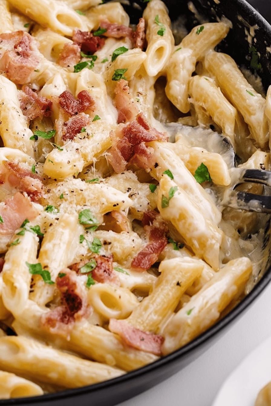 Massa cozida al dente banhada em molho cremoso feito com creme de leite fresco, leite integral e bastante parmesão. Bacon crocante na medida certa, com sabor intenso e aroma que invade a cozinha. Alho refogado na gordura do bacon traz aroma marcante sem queimar. Toque de pimenta preta, sal kosher e pitada de cebola em pó para equilíbrio de sabor. Por cima, salsa fresca para frescor e contraste. Receita versátil com toque de noz-moscada no molho, substituindo um terço do leite por caldo de galinha caseiro para dar profundidade e salvar quem não tiver creme de leite. Resulta em um prato reconfortante, cheio de texturas e camadas, pronto em cerca de 35 minutos.