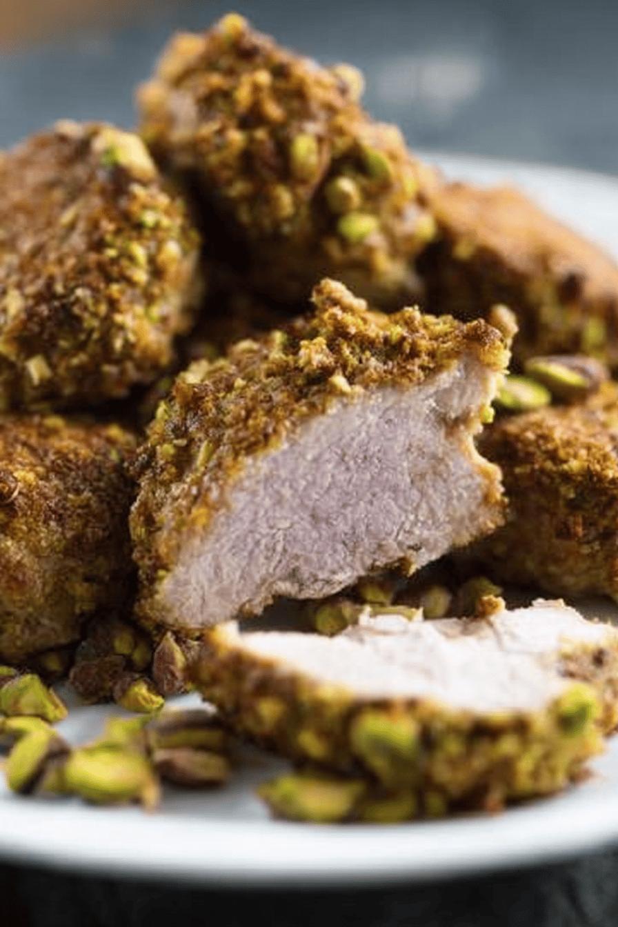 Fatias de lombo suíno empanadas com uma crosta crocante de pistache e pão ralado, aromatizadas com alho e alecrim. Fritas até dourar e depois finalizadas no forno, garantindo interior macio e suculento e exterior crocante. Troque o pistache por castanha de caju para variar e use farinha de arroz para versão sem glúten. Ajusta o calor da frigideira para não queimar a crosta, e observe o som do óleo ao fritar: está na temperatura certa quando chiar alto. Receita equilibrada entre textura e sabor, ideal para um jantar rápido mas recheado de personalidade e aroma herbal intenso.