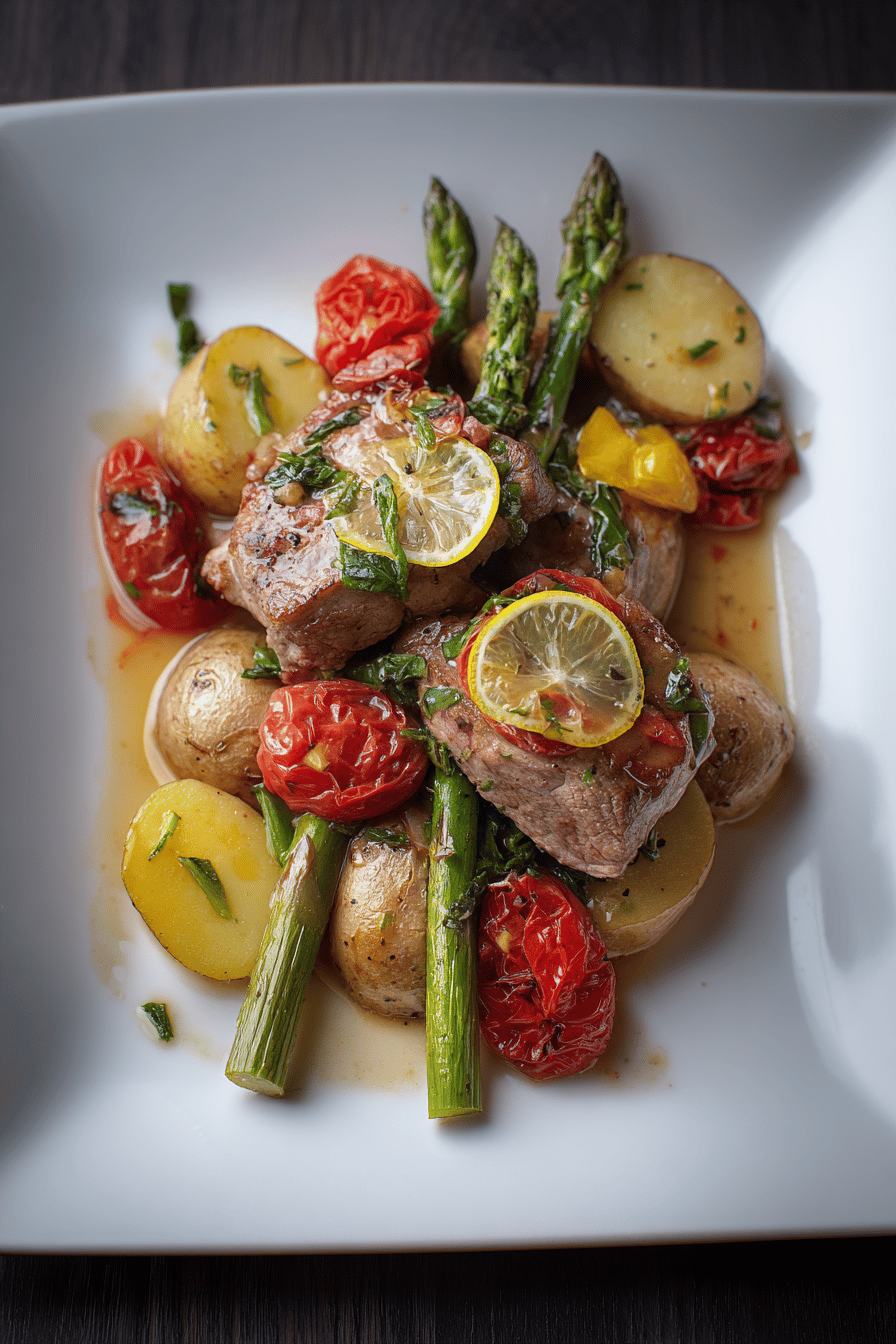 Medalhões de vitela com tomates frescos, cebola francesa e aspargos crocantes. Com toque de vinho branco e caldo, finalizado com manjericão. Troquei as batatas grelot por batata-doce para textura e aroma diferente; usei chalotas comuns no lugar das francesas e azeite aromatizado no lugar do puro. Um prato que mistura suculência da carne, acidez do tomate, frescor das ervas e crocância do aspargo. Cozinhar à vista, observando cor, som e cheiro. Importante tirar a carne antes do ponto final para descanso. A combinação de cores é charmosa e lembra receitas mediterrâneas, sem complicação e com ingredientes facilmente encontrados no Brasil. Pronta em cerca de 45 minutos, serve quatro pessoas.
