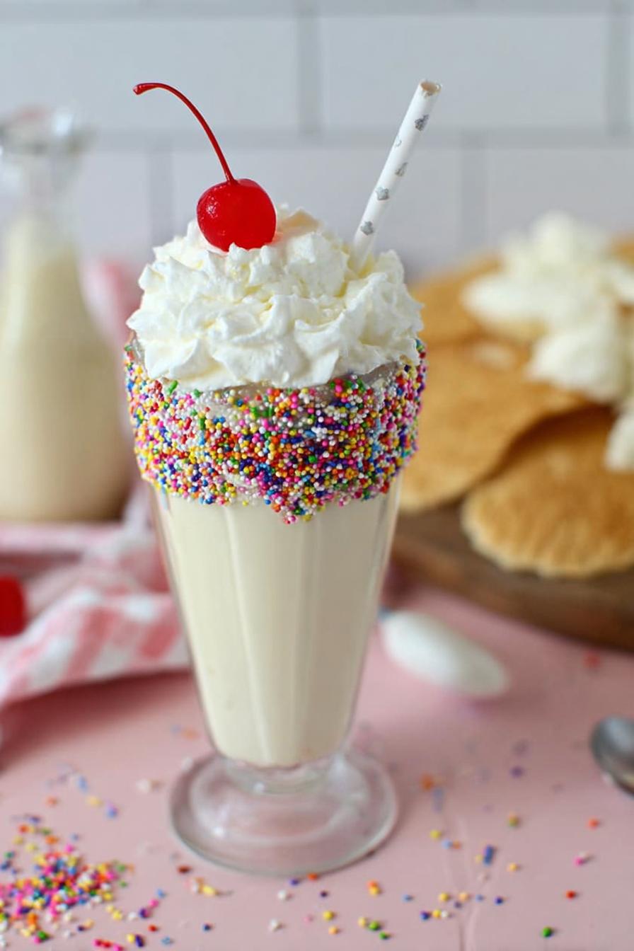Milkshake cremoso e encorpado combinando cheesecake com sorvete, leite e um toque inesperado de essência de baunilha para dar profundidade. Contorno da taça coberto por glacê e granulados coloridos pra festa nos olhos e na boca. Textura balanceada para não ficar nem pesado nem ralo, com chantilly e cerejas pra fechar com chave de ouro. Serve quatro copos grandes, ótimo para reunir amigos numa tarde quente. Receita revisada, evitando excesso na mistura pra não perder corpo, e substituindo o clássico cream cheese por um requeijão cremoso para facilitar e dar um sabor mais leve.