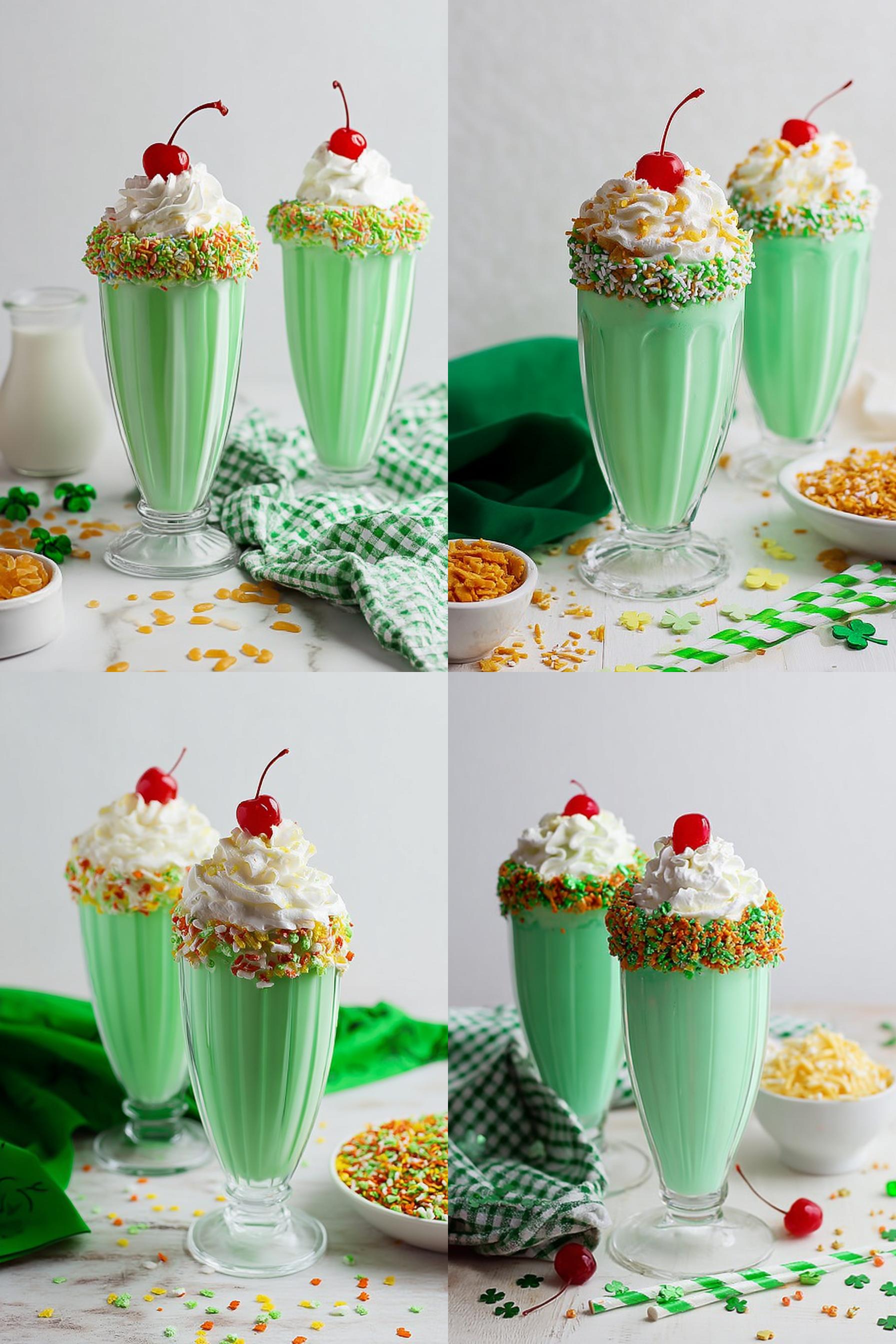 Milkshake cremoso de hortelã, versão verde vibrante, usando sorvete, leite integral, corante alimentar verde com uma pitada de extrato de hortelã. A borda do copo ganha cobertura de glacê de baunilha e confeitos coloridos que fazem contraste. Cobertura final com chantilly e cerejas ao maraschino. Receita rende duas porções generosas. Tempo total curto, ideal para refrescar dias quentes ou curtir com amigos. Base simples com toque adaptado para quem prefere sabor mais suave ou intensidade maior. Usado prática de pincelar a borda para garantir que confeitos grudem melhor, evitando frustração. Recebi dicas que misturar leite e sorvete na ordem correta faz toda a diferença na textura final.