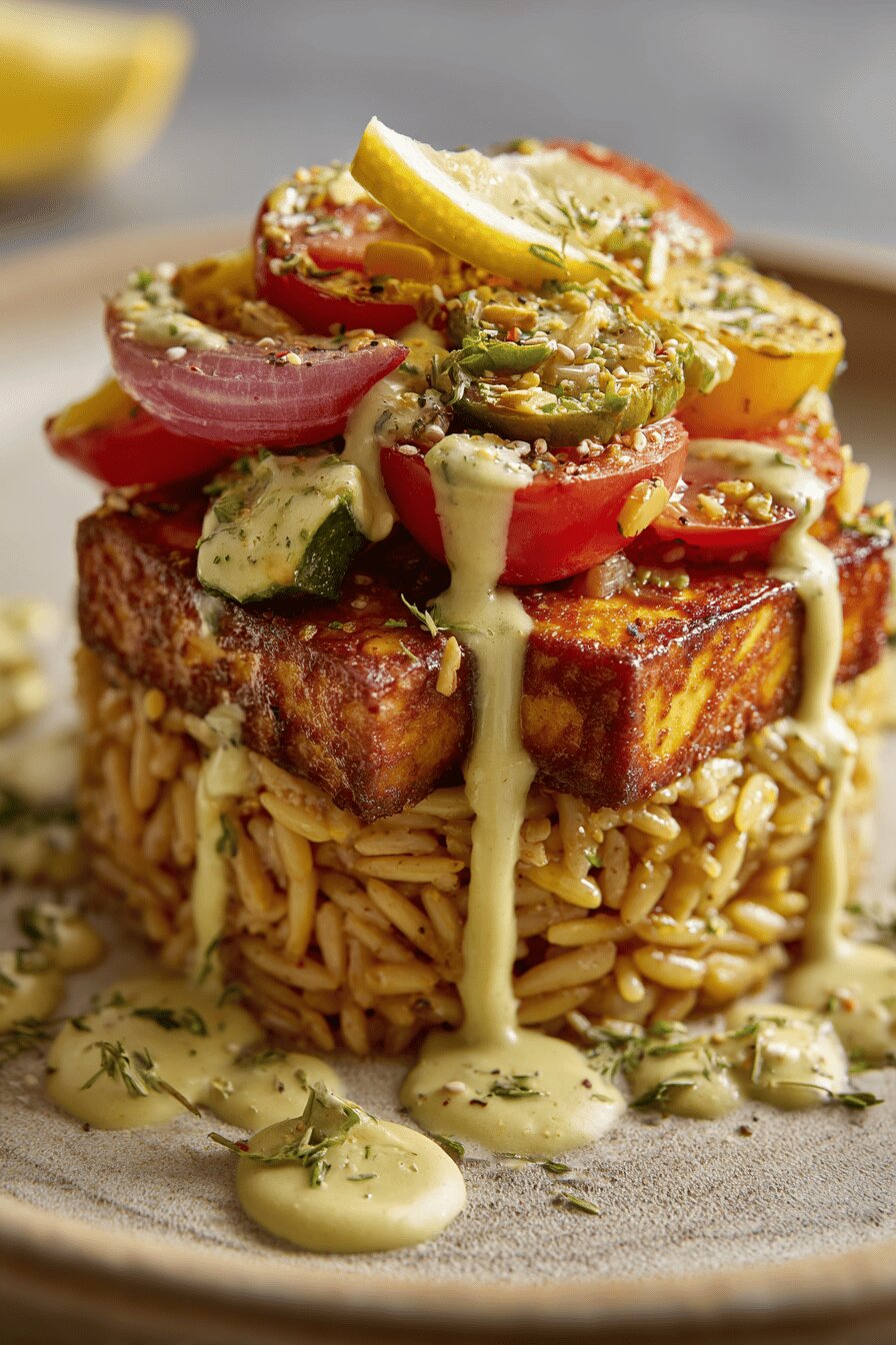 Pra quem já fez um monte de tropeços com tofu mole ou muito seco, achar o equilíbrio desse millefeuille foi um aprendizado. As camadas alternadas trazem sensação de comer um prato mais elaborado que uma simples salada, com crocância e frescor. A tostadura do orzo é minha sacada para fugir do trivial, o aroma que emana já engana na entrada. Tentar a emulsão com coentro no lugar da salsa foi arriscado, mas valeu certinho para quem quer fugir do usual sem perder a pegada cítrica. Não tem segredo se você prestar atenção no timing e nos toques de sabor durante o preparo. Um almoço leve, cheio de camadas para explorar boca e testa.