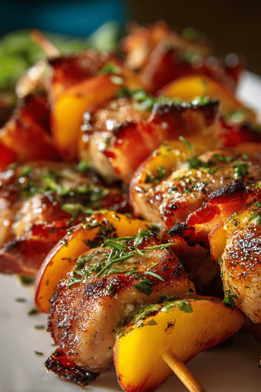 Espetinhos com pedaços de coxa de frango sem osso, pêssegos frescos e bacon enrolados, marinados em uma mistura agridoce e grelhados na brasa. O toque extra vem da substituição do mel por açúcar mascavo e o vinagre de vinho branco por vinagre de maçã. Além disso, adiciona-se um pouco de páprica defumada na marinada, equilibrando sabores. Prato feito para quem curte combinações doces, salgadas e um leve defumado, em porções pequenas e saborosas. Cozimento na brasa com etapa indireta para garantir suculência do frango, em aproximadamente 50 minutos totais. Serve 24 unidades, ótimo para petisco ou entrada em reunião com amigos.