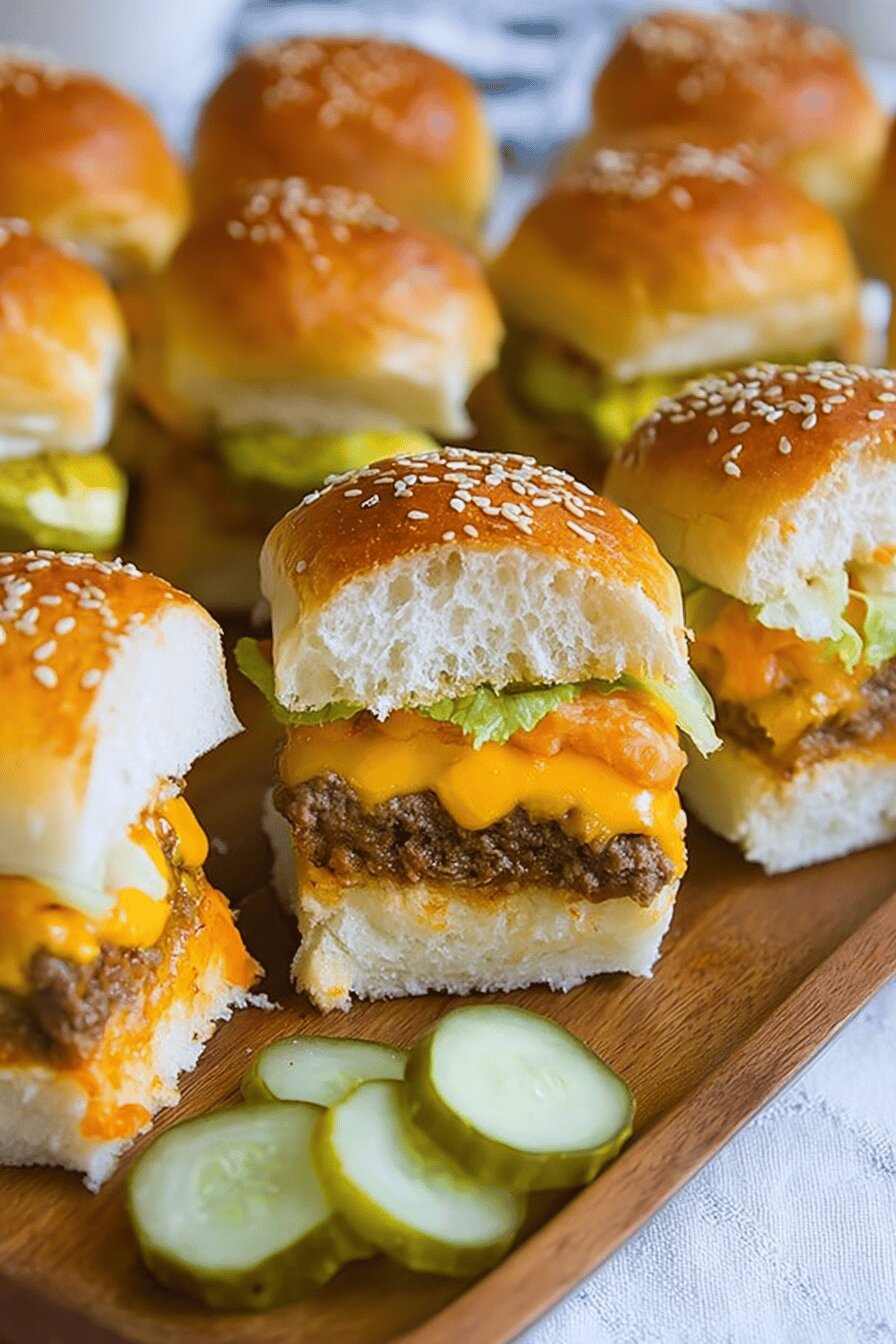 Pequenos lanches inspirados no clássico Big Mac, feitos com carne moída usada na medida certa, molho com um toque diferente e pão tipo brioche para dar uma textura mais macia e levemente adocicada. Ajustei as quantidades dos temperos para dar mais equilíbrio entre sal e especiarias. O preparo foca no ponto exato da carne e na montagem rápida para não deixar o pão encharcar. Perfeito para festas e reuniões, traz um aroma intenso de carne e molho que mingua na cozinha puxada para o cheiro de alho e cebola. O uso de cheddar ao invés de queijo americano dá um toque irregular e saboroso, com presença mais forte. Servem 12 mini sanduíches.