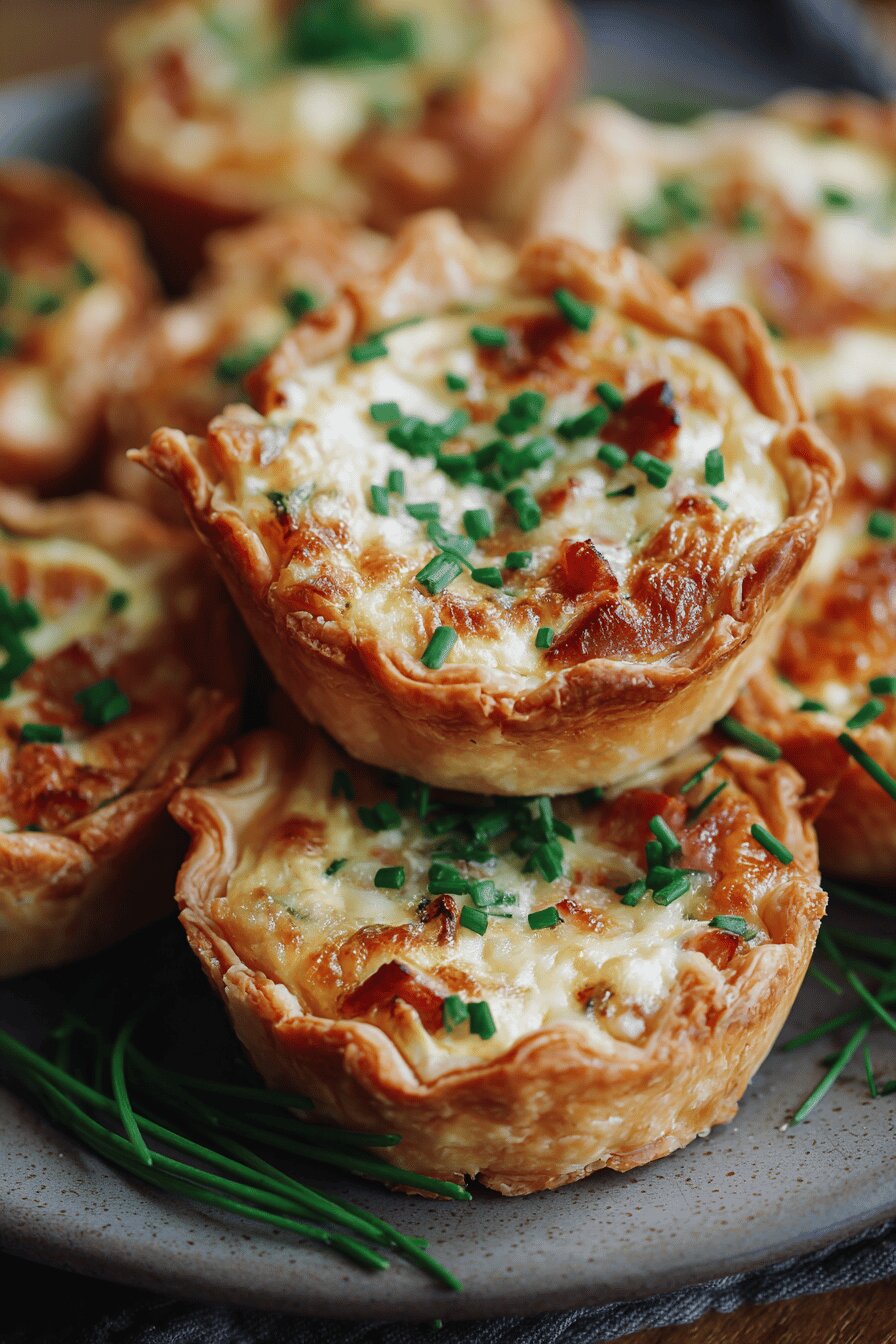 Pequenas quiches com massa quebrada, endívias e presunto. Massa crocante feita com creme azedo para textura leve. Recheio com presunto em cubos, endívias refogadas no azeite com cebola roxa e alho, ovos batidos e leite para ligar, além de queijo queijo prato ralado. Cebolinha fresca no topo. Ideal para lanches ou entradas. Variação com cogumelos substituindo o presunto e toque de noz moscada no recheio. Assa até dourar, visual dourado intenso e firme ao toque. Molho azedo ajuda na crocância e sabor levemente ácido que corta a doçura da endívia às vezes amarga.