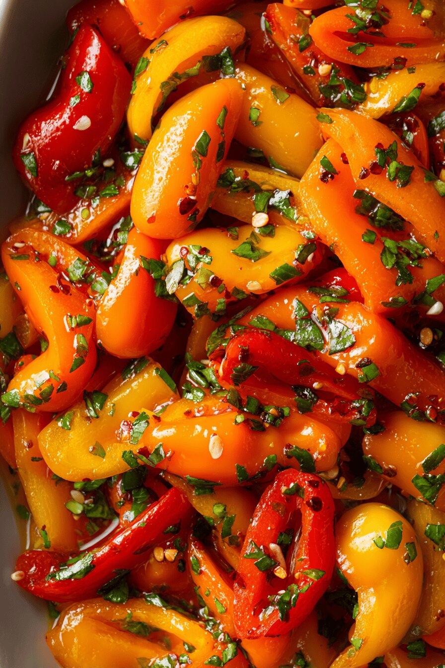 - 💡 Escolha pimentões coloridos. Assim cria um prato vibrante. Visuais atraem. Minipoivrons são ideais, se não achar, use pimentões comuns. Corte em tiras finas e ajuste o tempo de forno. Importante ficar de olho durante o processo. Peito de pimento quebrando o dente é sinal de perfeição. Cada minuto conta.