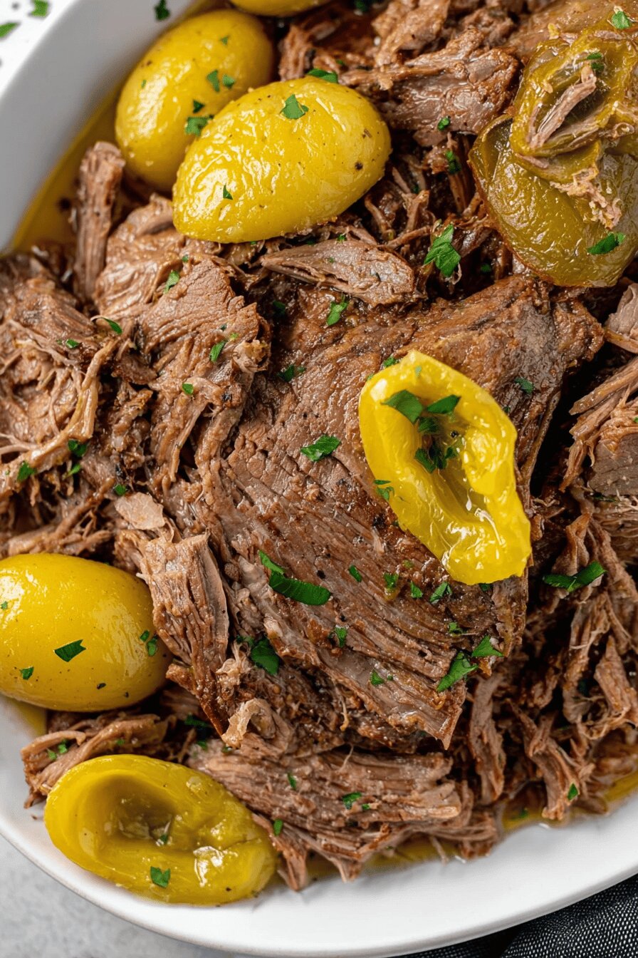 Carne de primeira cozida lentamente com mistura temperada, manteiga, cebola e pimenta pepperoncini. Usa caldo de carne caseiro com molho inglês para um fundo rico. Carne macia, desfiando fácil com garfo. Molho reduzido com amido de milho cria cremosidade imediata. Receita fácil, virou clássico em minha cozinha, mas com toque nacional trocando um ingrediente por algo do nosso quintal.