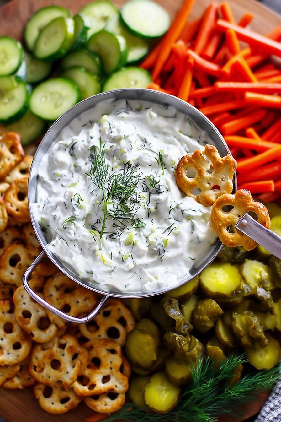 Uma pasta refrescante feita com cream cheese e creme de leite azedo, misturada com pepinos em conserva picados, suco dos pepinos, cebolinhas, endro fresco, alho em pó, sal e pimenta. Leva um descanso na geladeira para firmar, ficando pronta para acompanhar petiscos variados, de pães a vegetais. Ajustes como trocar pepinos em conserva por picles caseiros criam texturas e sabores interessantes, além de adicionar ainda mais frescor. Essencial para quem curte receita prática, que respeita ingredientes, equilibrando acidez com cremosidade e aroma de ervas.