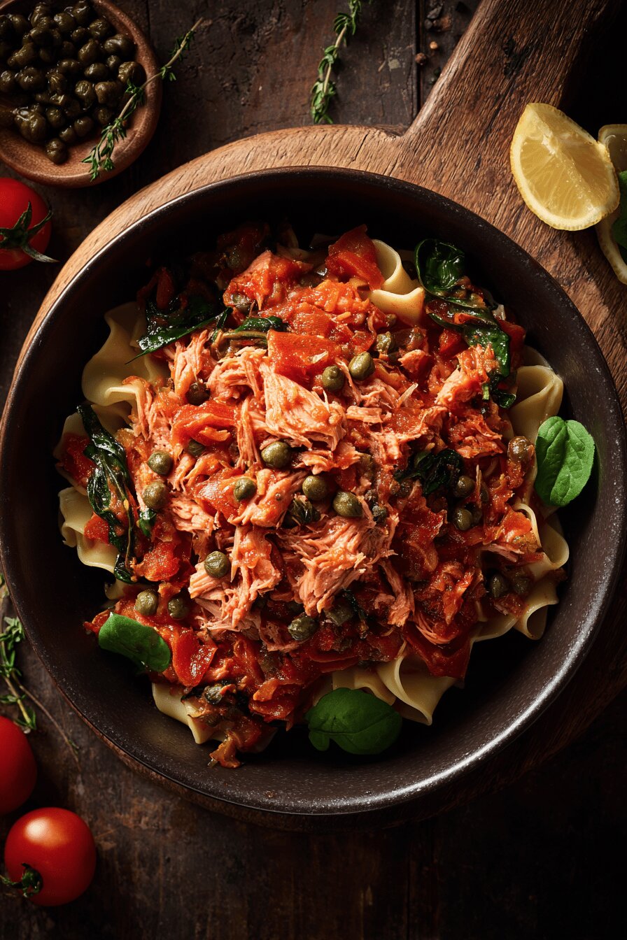 O mergulho de sabor aqui começa com tomates que não foram simplesmente cozidos, mas sim delicadamente grelhados para intensificar seu sabor, um truque que aprendi testando inúmeras vezes. Com a mistura do atum em água e azeitonas, o molho ganha uma profundidade salgada que salta na boca. A combinação com salsão e alho cria aquele aroma que invade a cozinha toda, e as cebolinhas jogadas por cima entregam a frescura necessária para equilibrar. Ideal para quem sabe apreciar texturas contrastantes e quer um molho que foge do trivial, com cara de casa, de cozinha que entende o que faz. Fácil de ajustar, com ingredientes versáteis, e serve como base para variar com outros peixes ou ervas – já brinquei trocando as ervas, fica bom também com manjericão ou tomilho.