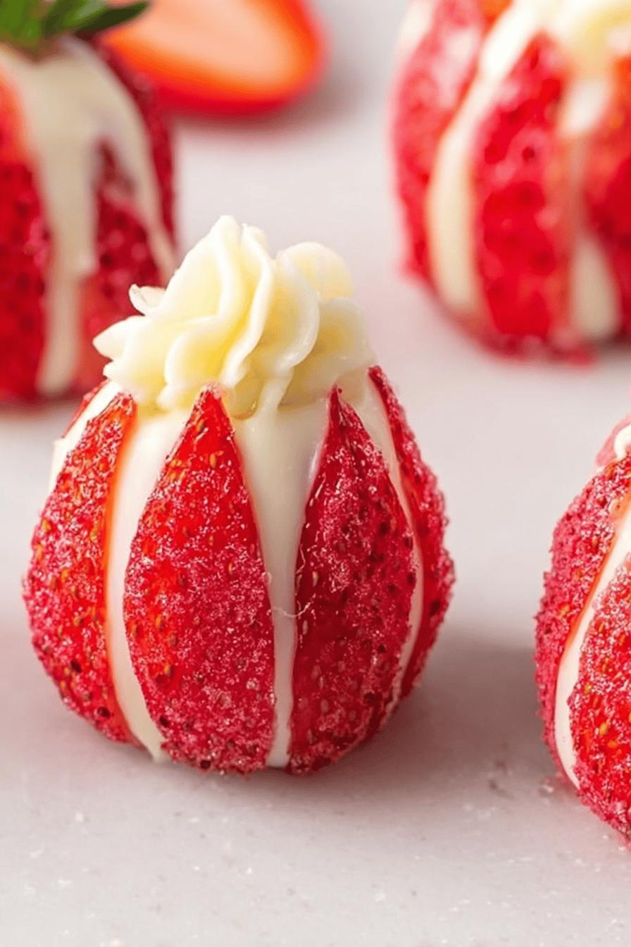 Morangos frescos cortados parcialmente para criar uma cavidade, recheados com um creme de queijo cremoso, açúcar de confeiteiro, creme azedo e essências de baunilha e limão siciliano para um toque diferente. Finalizados com farofa crocante de biscoito, uma combinação de texturas e sabores que entregam frescor e doçura equilibrada. Receita rápida de montar, sem necessidade de forno, ideal para sobremesas improvisadas ou festas. Atenção ao manuseio para evitar que o creme vaze pela umidade das frutas. Serve 6 pessoas com porção moderada, ótima pra quem curte doces leves e aromáticos.