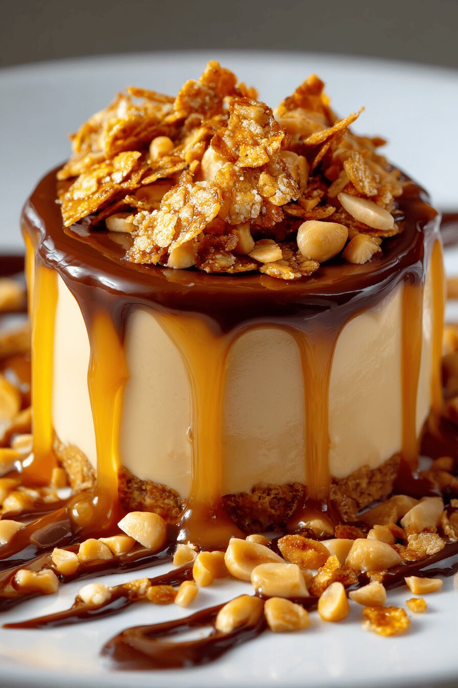 Sobremesa com mousse de pasta de amendoim, caramelo e crocante de chocolate. Usa gelatina hidratada em água gelada, creme fresco batido, e mistura feita no fogão até engrossar. Crocante com cereal de milho e amendoim torrado envolto em chocolate, manteiga e mel. Refrigeração para firmeza. Servido com caramelo industrializado para contraste doce-salgado. Sem glúten e sem castanhas, apenas amendoim.