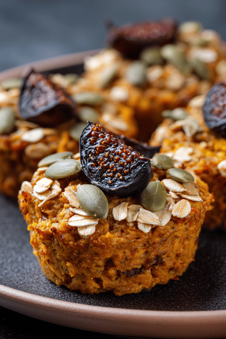 Muffins com batata-doce, farinha de trigo integral em quantidade reduzida, açúcar mascavo, aveia grossa, farelo de trigo, fermento e bicarbonato. Temperos, ovos, leite, óleo de girassol e melaço. Frutas secas variadas trocadas por damascos e cranberries secas. Cobertura opcional com aveia, sementes de girassol e fatias de tâmara. Massa úmida, textura macia e aroma de especiarias, ideal para café da manhã ou lanche.